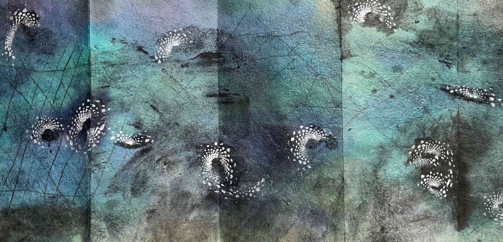 Ex humus è uno degli infiniti punti di vista sull’universo frattale in progress costruito dall’artista. Stefania restituisce nello spazio dello Studio Elisi opere sul rapporto di seduzione che la natura esercita sull’essere umano contemporaneo. E’ l’inizio di un viaggio verso la conoscenza interiore guardando all’universo tutto. Il mezzo utilizzato è l’ideazione fuori dagli schemi propria dell’invenzione attraverso l’utilizzo di materiali più vari. La carta velina usata nella sartoria, come imballaggio per alimenti nella serie Legami è supporto per i disegni frattali a penna, filo da cucito, china, pittura metallica; il chewing gum combinato al glitter è utilizzato come materiale plastico per dare forma ai micro mondi Happy fractal; combinazioni ibride tra frammenti di minerali e calchi di broccolo romanesco realizzati con cera d’api o ceramica costituiscono la serie Mineral fractal. Per certi versi, il lavoro più dark è Legami frattali. Privi di guida, Stefania ci conduce ancora nei luoghi più profondi del sentire senza fare ricorso alla rappresentazione e alle pratiche tradizionali. Una decina di anni fa ha sepolto in una foresta pezze di stoffa, foulard. Sotto terra li ha lasciati macerare. Recuperati in tempi diversi, nei loro vari stadi di degrado, li ha sistemati ciascuno a seconda della loro condizione: alcuni in scatole di cartone con rami di larice, altri sospesi come sindoni. Tutti restituiti come spoglie. Materia, spazio e tempo si uniscono per dare forma a un Ex humus originario, ben lontano dal giocoso perturbante dell’innocuo mondo fantastico. La terra non serve per modellare ceramica, per incamiciare sculture, la terra è quella da cui muoviamo, a cui torneremo.