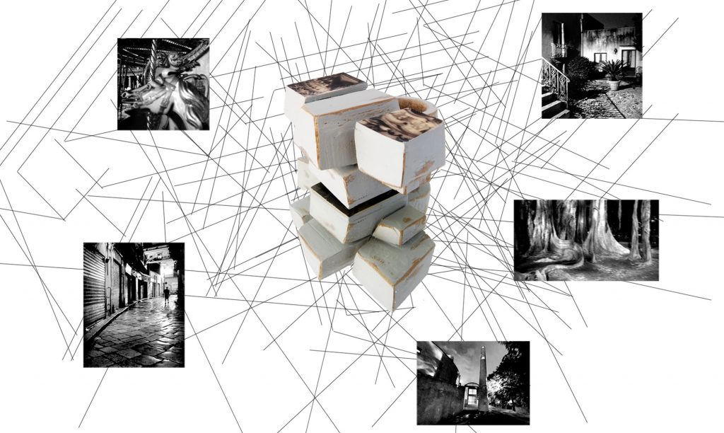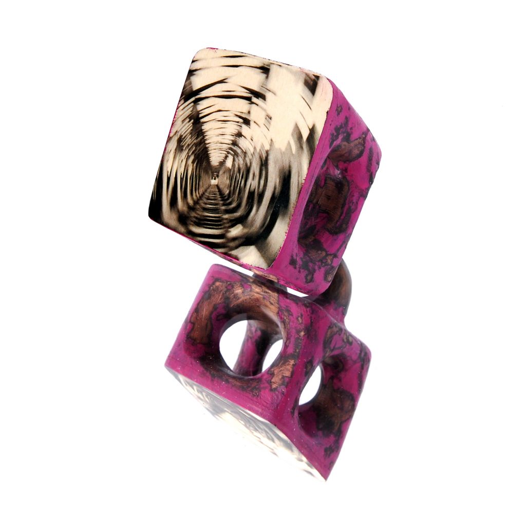 La collaborazione tra Fabrizio Bonvicini, maestro scultore di architetture indossabili e Marina Giannobi, fotografa di percezioni notturne, porta alla realizzazione di una serie di anelli in legno con inserti fotografici. Queste piccole sculture restituiscono uno sguardo sul mondo con geometrie architettoniche, colori che ne sottolineano i volumi e immagini in bianco e nero misteriose ed evocative. Forme come rocce islandesi, colori come templi indù, immagini indefinite come la notte, ci trasportano nei più remoti luoghi.