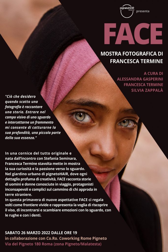 In una cornice del tutto originale e nata dall’incontro con Stefania Seminara, Francesca Termine stavolta mette in mostra la sua curiosità e la passione verso lo sguardo. Nel giardino urbano di pignetoHAIR, dove ogni dettaglio profuma di creatività, FACE racconta storie di uomini e donne conosciute in viaggio, protagonisti inconsapevoli e complici sul cammino di chi approda in terre straniere. In questa primavera di nuove aspettative FACE ci regala volti come frontiere vivide e rappresenta la voglia di riscoprire il viso, di incontrarsi e scambiare emozioni con lo sguardo, con le rughe e con i denti.