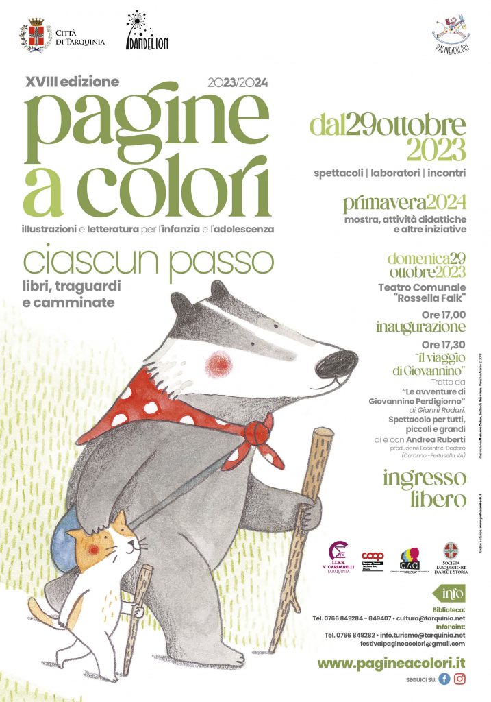 PAGINEaCOLORI diventa maggiorenne. Il festival della letteratura illustrata per l’infanzia e l’adolescenza festeggia la sua 18esima edizione, che prenderà il via, a Tarquinia, il 29 ottobre. Il tema di quest’anno è il “camminare”, come sottolinea il titolo della manifestazione “Ciascun passo: libri traguardi e camminate”, ed è stato scelto quale nucleo di riflessione sull’evoluzione avvenuta in questi anni di appassionato lavoro e sull’approdo della rassegna al significativo e importante traguardo dei 18 anni di vita. “Camminare, avanzare, procedere: azioni animate da un’aspirazione convinta a crescere, a conseguire un traguardo e a “diventare grandi” per raggiungere una condizione di maggiore autonomia, conoscenza e consapevolezza sulle cose del mondo – afferma la direttrice artistica Roberta Angeletti -. Metafora perfetta della crescita, della ricerca di una direzione, di un “muoversi verso”, dei complessi processi evolutivi che determinano il passaggio dall’infanzia all’età adulta, con abbondanti implicazioni di natura pedagogica, psicologica ed educativa, il tema del camminare verrà esplorato anche secondo altre accezioni, come per esempio, quella che pone l’azione del camminare in relazione con gli aspetti evoluzionistici, quelli fisici e filosofici”.