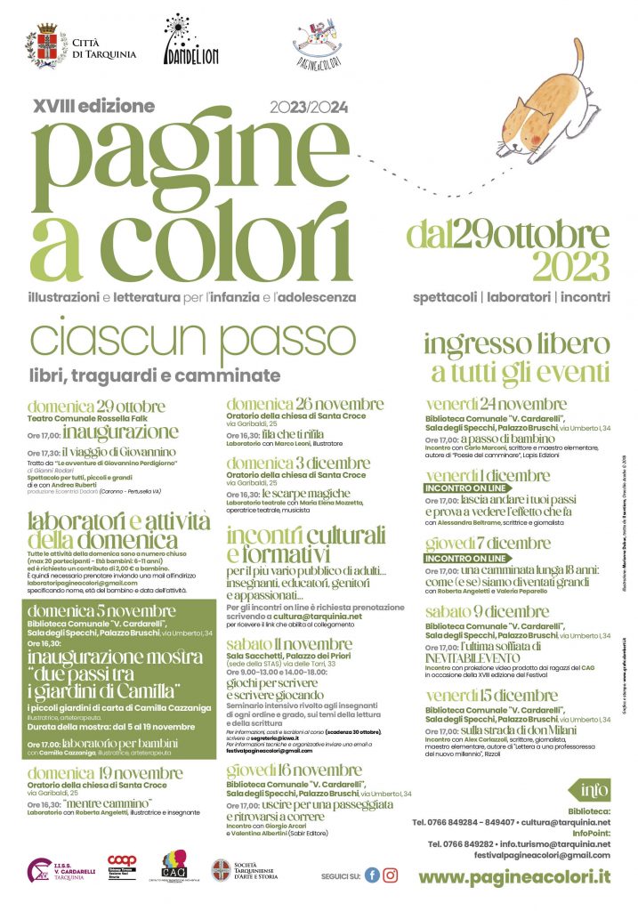 La sala degli Specchi di palazzo Bruschi Falgari, sede dalla biblioteca comunale “Vincenzo Cardarelli”, farà da cornice a un ciclo di incontri in presenza con autori ed editori, che avranno inizio alle 17. Il 16 novembre saranno ospiti Giorgio Arcari e Valentina Albertini, che racconteranno la storia di Sabir Editore. Il 24 novembre, sarà la volta di Carlo Marconi, maestro elementare e scrittore speciale, con la raccolta “Poesie del camminare”. Il 9 dicembre sarà proiettato il video realizzato dai ragazzi del Centro aggregazione giovanile di Tarquinia, in occasione della 17esima edizione di PAGINEaCOLORI. Il 15 dicembre, ci sarà Alex Corlazzoli, maestro, giornalista e scrittore, collaboratore con "Altreconomia", "Che futuro!" e "il Fatto Quotidiano", dove tiene anche un blog, che farà “camminare” il pubblico “Sulla strada di don Milani”. Per gli incontri online, rivolti a insegnanti, educatori, genitori e appassionati di letteratura, le date da segnare sono il 1° dicembre, con la scrittrice e giornalista Alessandra Beltrame, che, attraverso i propri libri, farà conoscere il suo mondo intimo fatto di sentieri, incontri e ricerca di senso della vita; e il 7 dicembre con la direttrice artistica del festival Roberta Angeletti e la rappresentante dell’associazione Dandelion Valeria Peparello, che ripercorreranno le 18 edizioni del festival e presenteranno i libri scelti per la mostra delle illustrazioni ad aprile 2024.