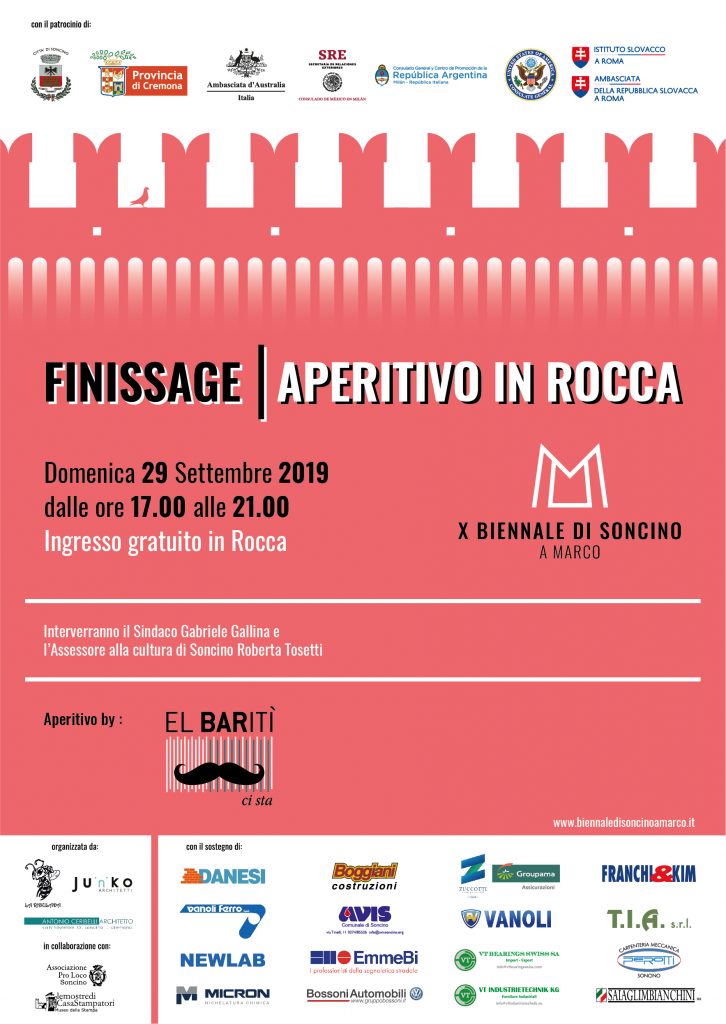 Domenica 29 Settembre alle ore 17.00 presso la Rocca Sforzesca chiuderà al pubblico la X edizione della Biennale di Soncino a Marco, esposizione internazionale di arte contemporanea a cura di Demis Martinelli, organizzata da La Ridulada, in collaborazione con Mauro Coppini, Clara Taverna, Natalia Vecchia, Sara Serina, Antonio Ceribelli, Michela Franzelli ed il Comune di Soncino.