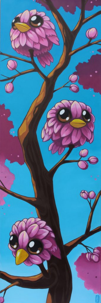 Sakura, una delle opere in mostra è stata d’ispirazione per il grande murale inaugurato a ottobre sulla facciata cieca di un palazzo popolare in Via amoretti 12 a Quarto Oggiaro.