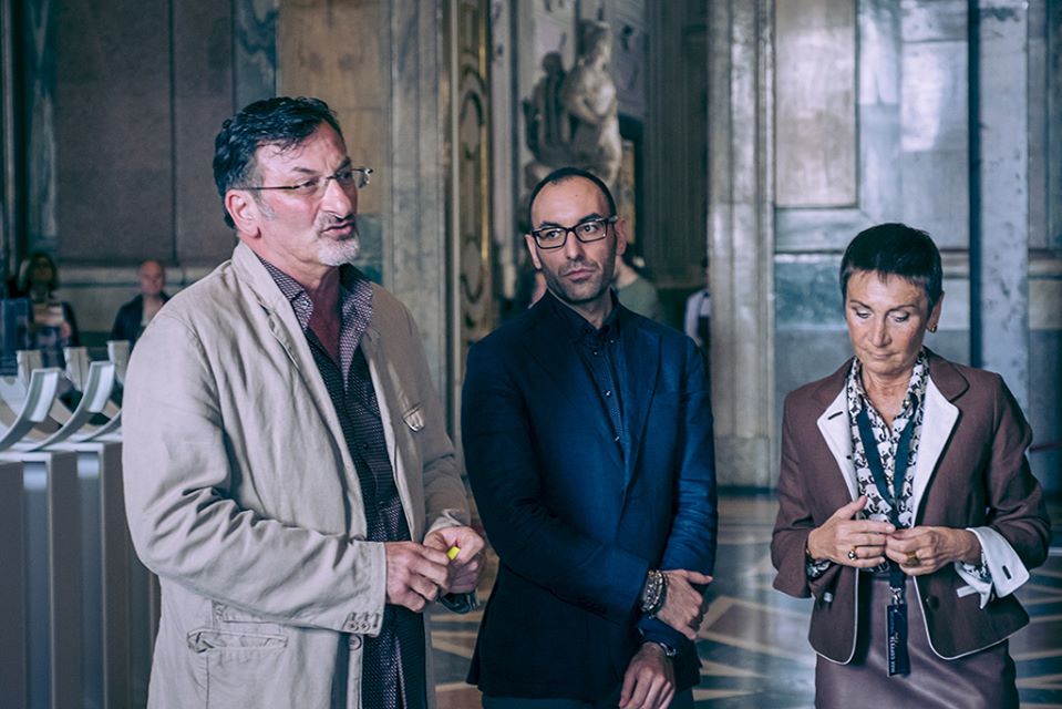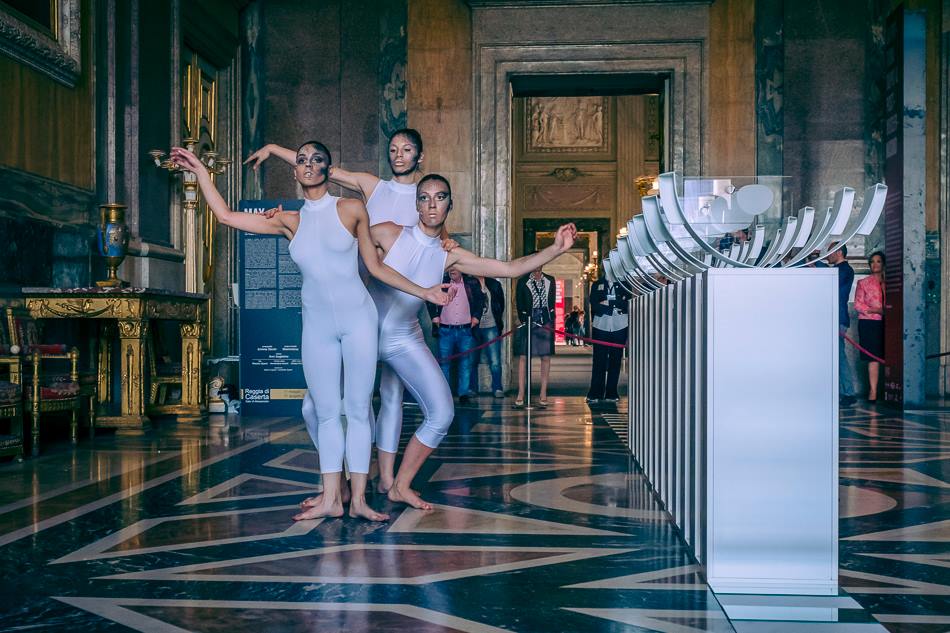 La Reggia di Caserta, cuore pulsante e vivo dell’opera vanvitelliana, è caratterizzata dalle meraviglie del parco con le sue fontane alimentate dall’acquedotto Carolino. Questo è il punto di congiunzione che apre una profonda riflessione e connessione con gli archi e i vetri di Flow. L’acqua diventa elemento che genera vita e movimento, mentre l’arco è un chiaro riferimento sia alla struttura architettonica dell’acquedotto, sia alla gabbia toracica, che nella scultura protegge il corpo vivo e fragile del cristallo, sinonimo degli organi vitali dell’opera. Mettere in relazione un progetto ingegneristico e architettonico con il pensiero poetico dell’installazione, è un modo per poter cogliere gli elementi che dal contemporaneo ci portano indietro, in un passato dove l’immaginazione si concretizzava nella realizzazione di grandi opere.