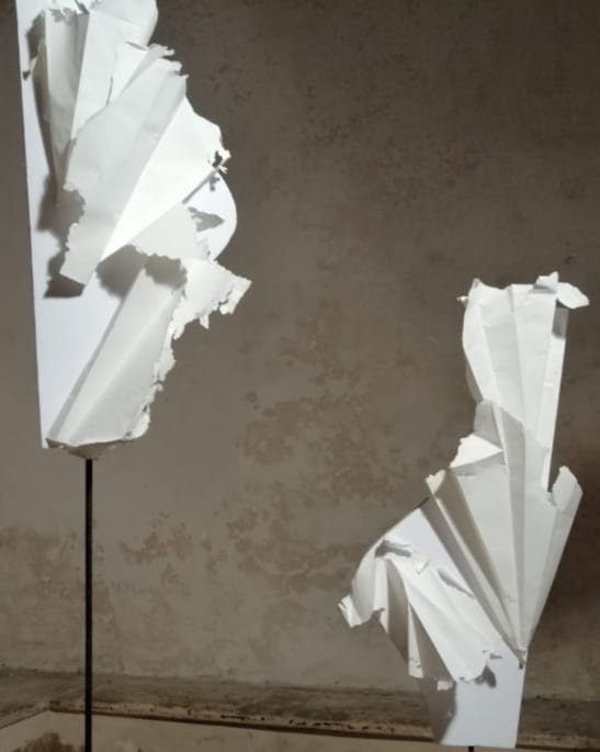 In volo è un’installazione, in carta fatta a mano montata su aste di ferro inserite in blocchetti di laterizio, che allude al volatile fluttuare nell’aria.