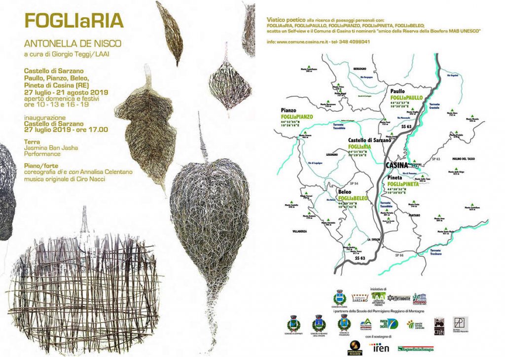 FOGLIaRIA di Antonella De Nisco al Castello di Sarzano e in alcuni luoghi scelti del territorio casinese, viatico poetico alla ricerca di paesaggi personali con FOGLIAaRIA, FOGLIaPAULLO, FOGLIaPIANZO, FOGLIaPINETA, FOGLIaBELEO; scatta un Self-view con le installazioni e il Comune di Casina ti nominerà “amico della Riserva MaB UNESCO Appennino tosco - emiliano”