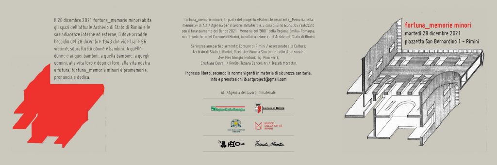 Il 28 dicembre 2021 fortuna_memorie minori abita gli spazi dell’attuale Archivio di Stato di Rimini e le sue adiacenze interne ed esterne, lì dove accadde l’eccidio del 28 dicembre 1943 che vide tra le 56 vittime, soprattutto donne e bambini. A quelle donne e ai quei bambini, a quella bambine, a quegli uomini, alla vita loro e dopo di loro, alla vita nostra e futura, fortuna_memorie minori è promemoria, pronuncia e dedica.