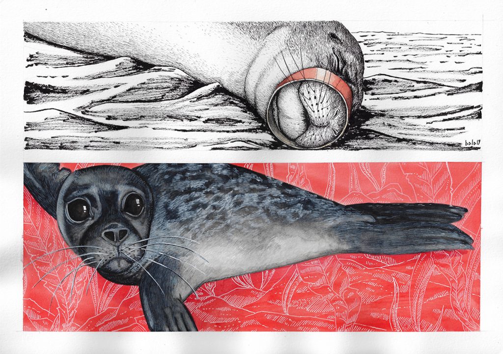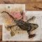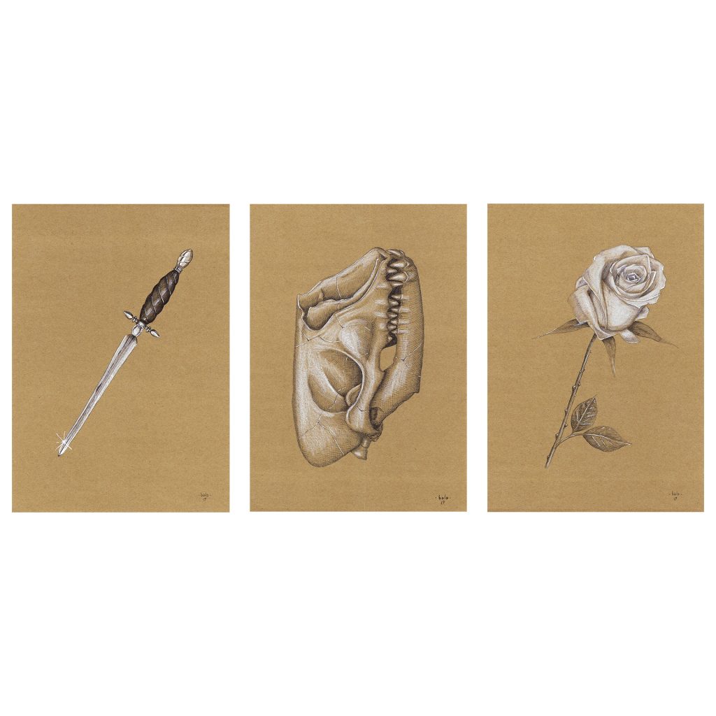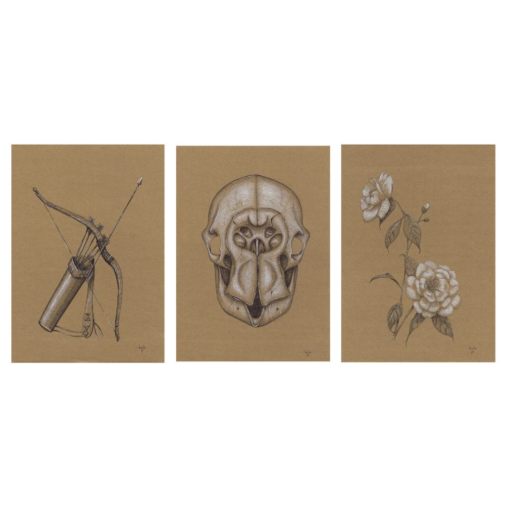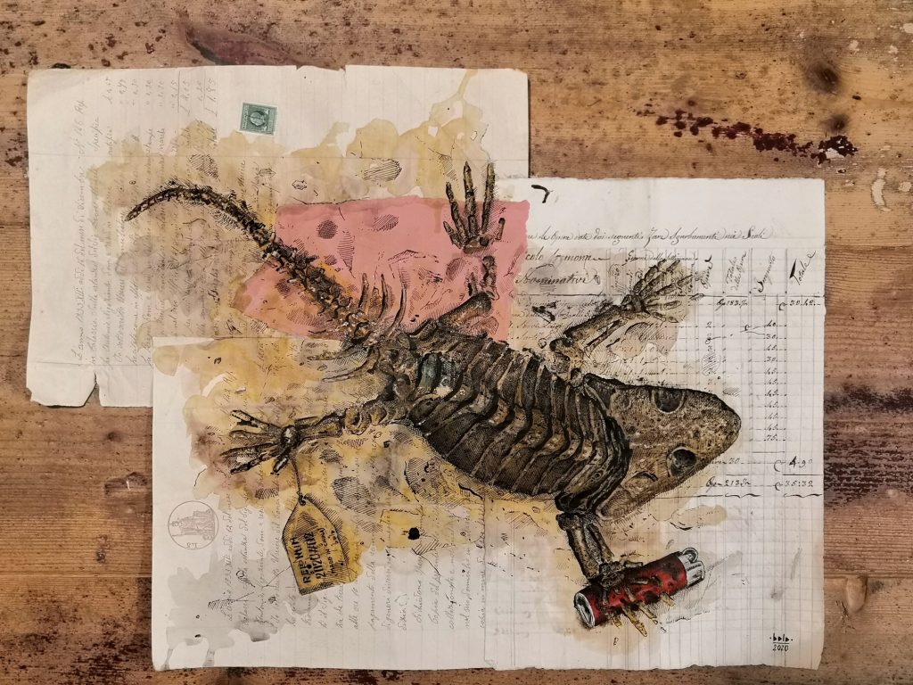 Sono soprattutto le carte antiche che utilizza Alessio Bolognesi in questi suoi ultimi lavori, supporto il cui colore richiama quello delle rocce all’interno delle quali sono rimaste intrappolate creature preistoriche, le tinte piatte dell’acrilico, quelle incontrollate dell’acquerello e la precisione dei pennini a china cercano di riportare ossa e resti fuori dalla superficie mescolandoli con impressioni e suggestioni del nostro futuro, giochi di ombre, di tracce, di segni carpiti come attraversamento di un tempo interiore.