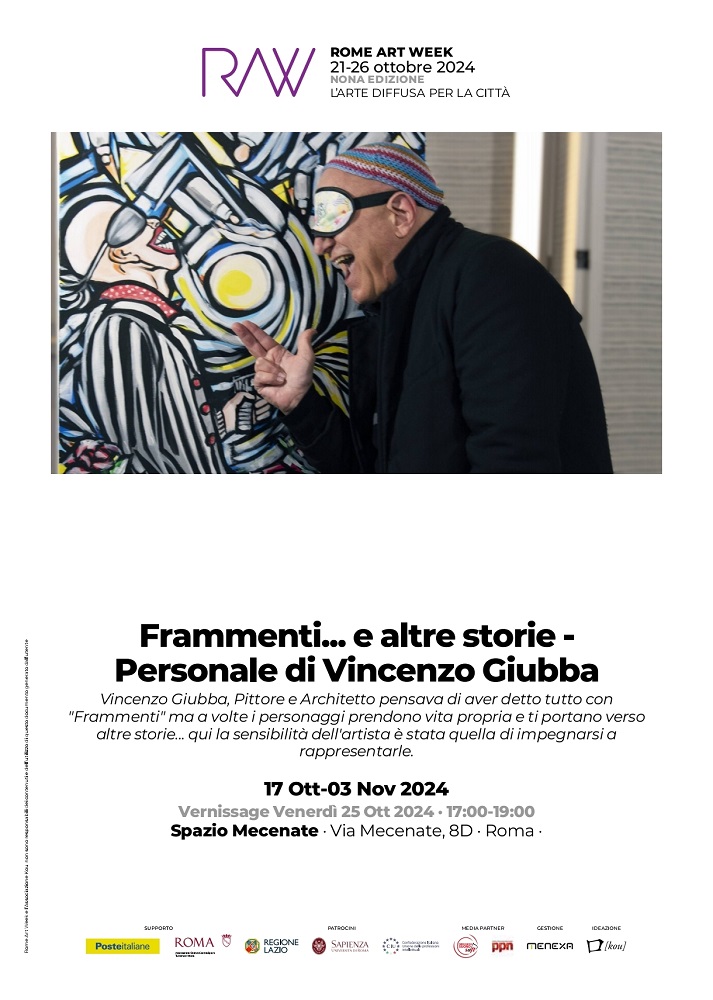 “Frammenti… e altre storie” è inserita nel programma di Rome Art Week 2024 con un talk con l’artista il 25 ottobre 2024 dalle 17.00 alle 19.00, questo il link dell’evento: https://romeartweek.com/it/eventi/?code=FBAEMQ