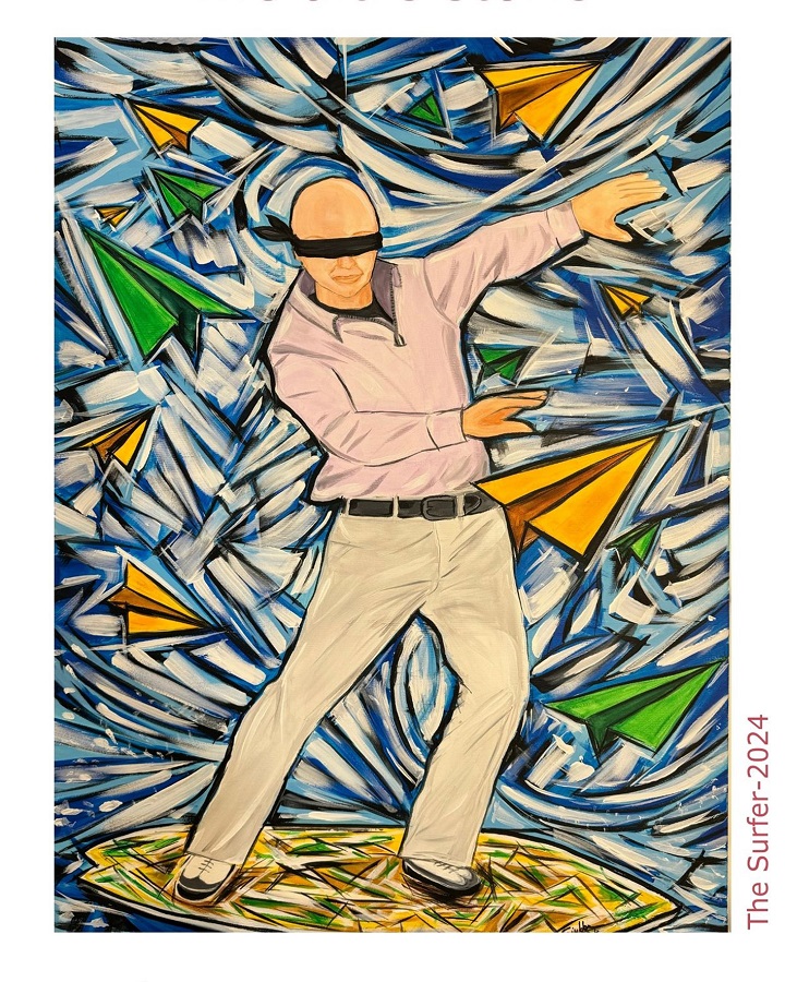 Un soggetto bendato e giocoso irridente ad una realtà pericolosa e tenebrosa; simbolo dell'uomo di oggi, sempre in equilibrio tra passato e futuro, sempre a galla nonostante i pericoli e gli ostacoli... un eroe del nostro tempo quello rappresentato dal Maestro nelle sue nuove opere.