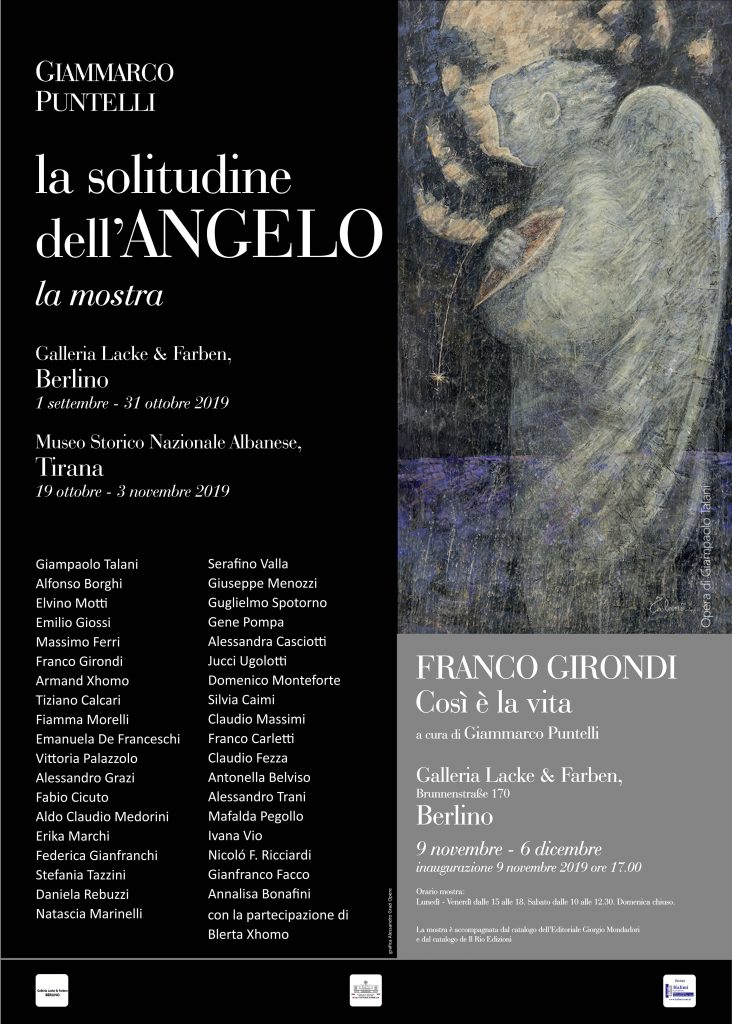 La personale fa parte del progetto curatoriale di Giammarco Puntelli La Solitudine dell’Angelo che si sviluppa tra Berlino e Tirana e che è accompagnato da un catalogo dell’Editoriale Giorgio Mondadori. La persona di Girondi ha anche un proprio catalogo edito da Il Rio Edizioni in cui è presente un testo di rara poesia firmato da Roberta Frabetti. Il saggio critico parte dal libro di Mario Luzi Viaggio terrestre e celeste di Simone Martini che diventa la chiave di lettura per leggere l’opera recente di Girondi.