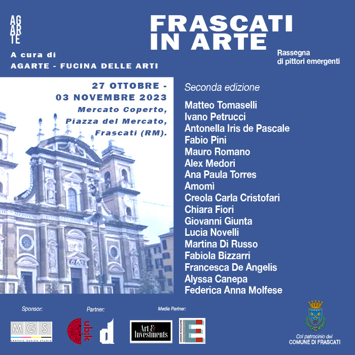 Seconda edizione della rassegna annuale di pittori emergenti “Frascati in Arte”: 17 artisti selezionati durante l’anno corrente dall’Associazione Culturale e Galleria d’Arte “Agarte – Fucina delle Arti” con sede in Frascati, mostreranno i loro ultimi lavori per un totale di circa 120 tele di diverso genere, stile e dimensione.