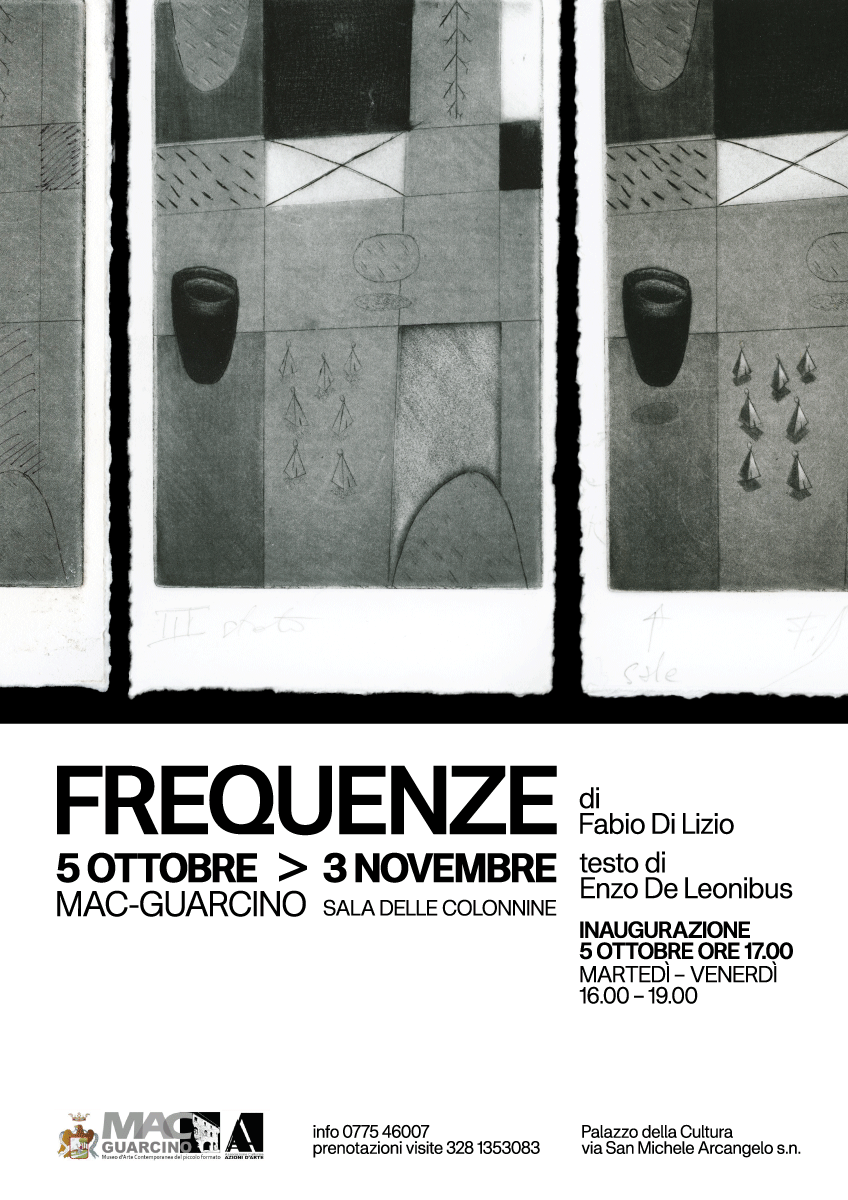 Le opere incisorie di piccolo formato di Fabio Di Lizio eseguite attraverso le tecniche della puntasecca e maniera nera, ripropongono nel contesto raccolto e prezioso della Sala delle Colonnine del MAC di Guarcino il delicato "passaggio di stato" che caratterizza il divenire continuo nella pratica incisoria, quindi il percorso del segno nelle continue ed innumerevoli sue trasformazioni.
