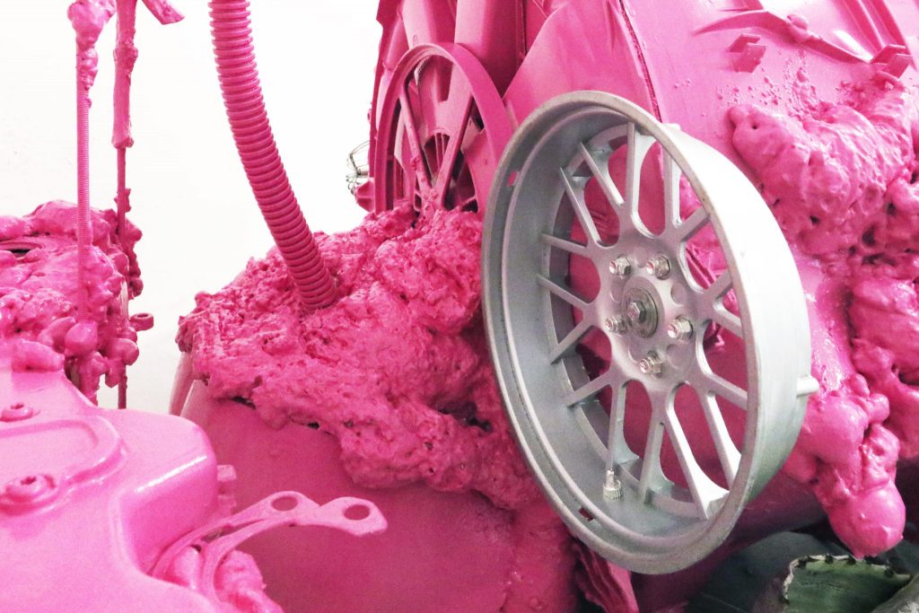 All’ingresso e nelle sale del Museo, le sculture e le installazioni dei due artisti esposte per la prima volta a Latina, creano un dialogo sui simboli e i miti della modernità attraverso un’estetica ibrida e perturbante. Le installazioni disposte nello spazio espositivo sembrano confondersi con gli oggetti della curiosa collezione del MUG, che raccoglie testimonianze sul progresso tecnologico, agricolo e industriale dalla seconda metà dell’Ottocento ai nostri giorni.