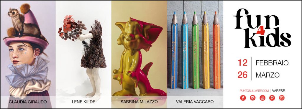 Il primo appuntamento dell’anno alla galleria PUNTO SULL’ARTE è una mostra lieve, un poker di artiste che vuole puntare lo sguardo sull’infanzia, sul gioco e su quelli che sono a tutti gli effetti gli attrezzi di lavoro di un bambino, quelli con cui lui costruisce la propria identità. Protagoniste due pittrici, SABRINA MILAZZO e CLAUDIA GIRAUDO, e due scultrici, VALERIA VACCARO e la norvegese LENE KILDE – quest’ultima, per la prima volta in Italia, esordisce con questo evento nella galleria varesina.