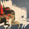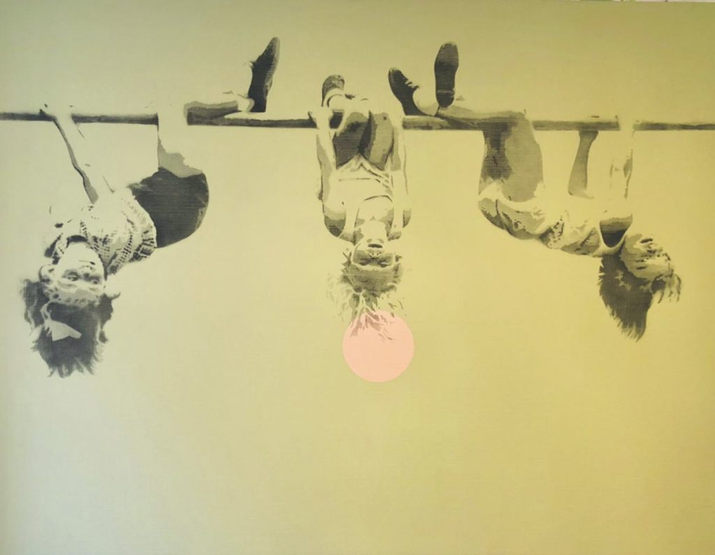 Cufrini nelle sue grandi opere perlopiù monocrome, inserisce figure isolate di bambini spensierati e intenti al gioco, ancora lontani dagli schermi ipnotici della tecnologia, che pure appare e si fa avanti, espandendosi all’orizzonte.