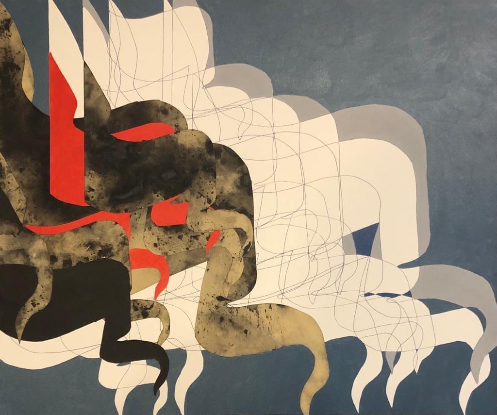 Più concettuale è la ricerca di Recchia, che presenta composizioni in cui segno e campiture cromatiche si bilanciano, nella reiterazione solo apparentemente confusa di uno schema simbolico, di bandiere svuotate di vessillo, potenzialmente portatrici di tregua o di nuove pericolose ideologie.