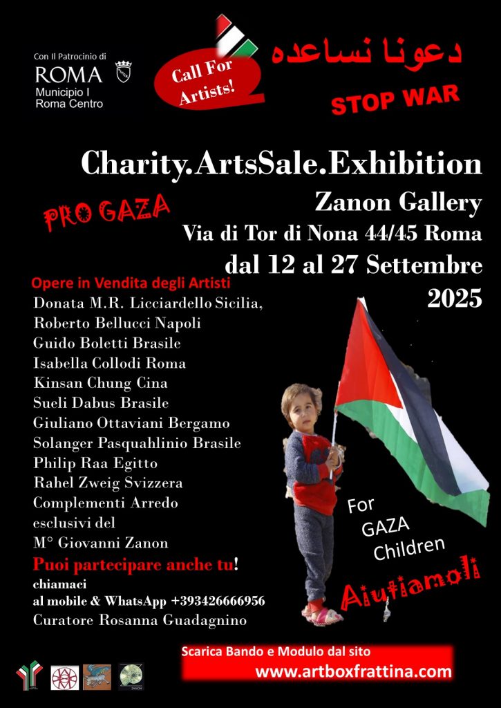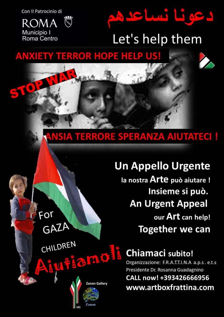 Stop War Charity.ArtsSale.Exhibition dal 12 al 27 Settembre presso la Zanon Gallery, la nostra Associazione FRATTINA, organizza la vendita per beneficenza dedicata ai Bambini di Gaza. Isciviti subito : vendendo le nostre opere possiamo aiutare tanti bambini dedicando a loro il 50% del ricavato. Siamo già in tanti unisciti a noi con solo 40.00 Euro farai parte del nostro gruppo che sarà pubblicato, promozionato e riconosciuto per la volontà e la sensibiltà che ci distingue Grazie a Tutti.