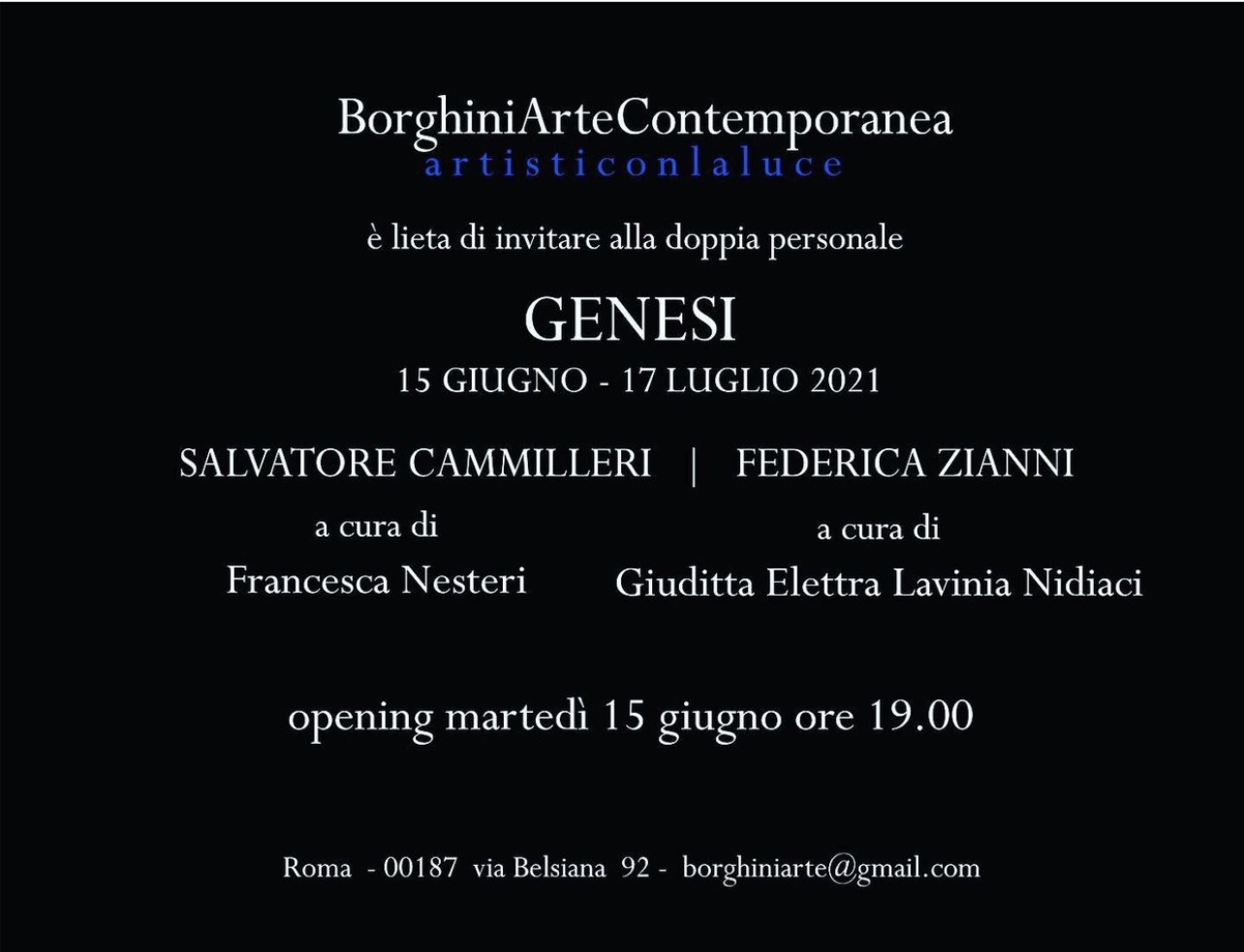 Genesi è il titolo della doppia personale di Salvatore Cammilleri e Federica Zianni che Borghini Arte Contemporanea inaugura martedì 15 giugno, a cura di Francesca Nesteri e Giuditta Elettra Lavinia Nidiaci.