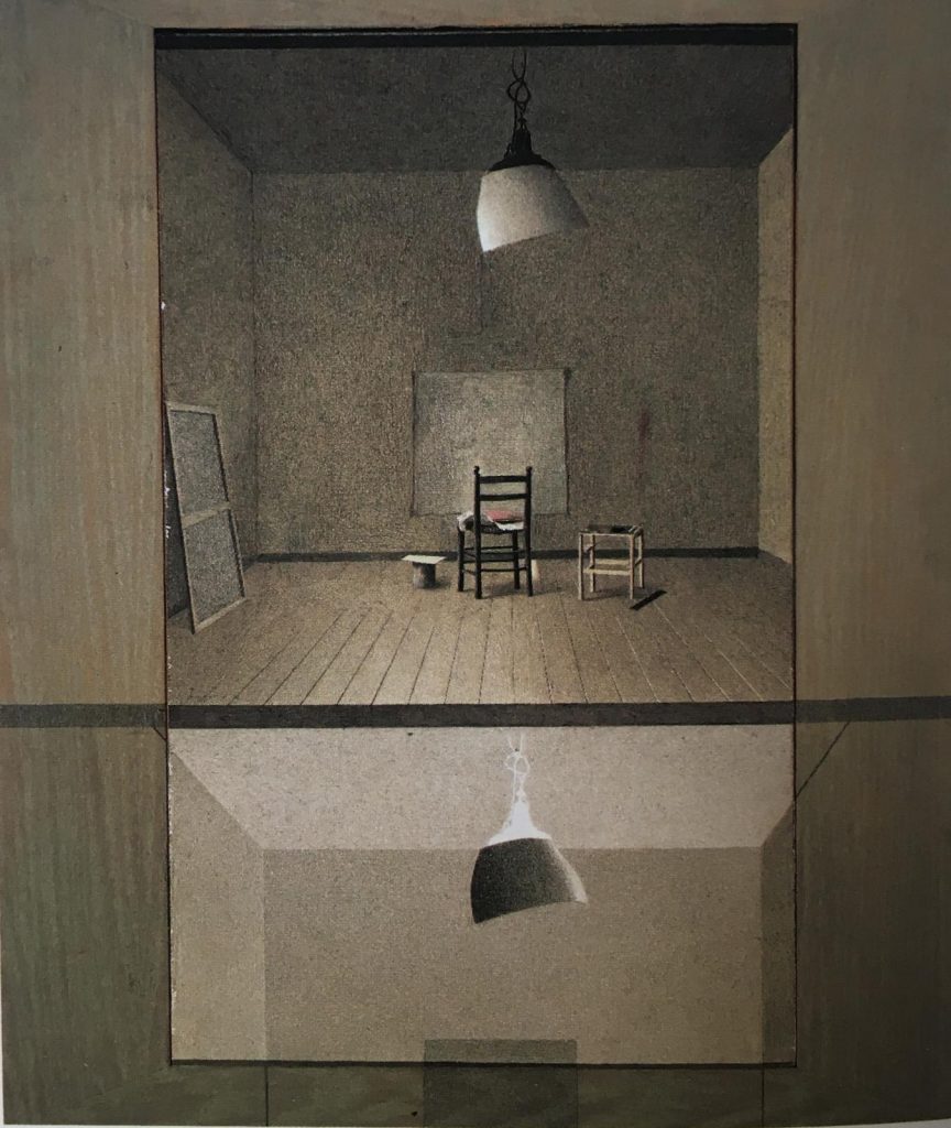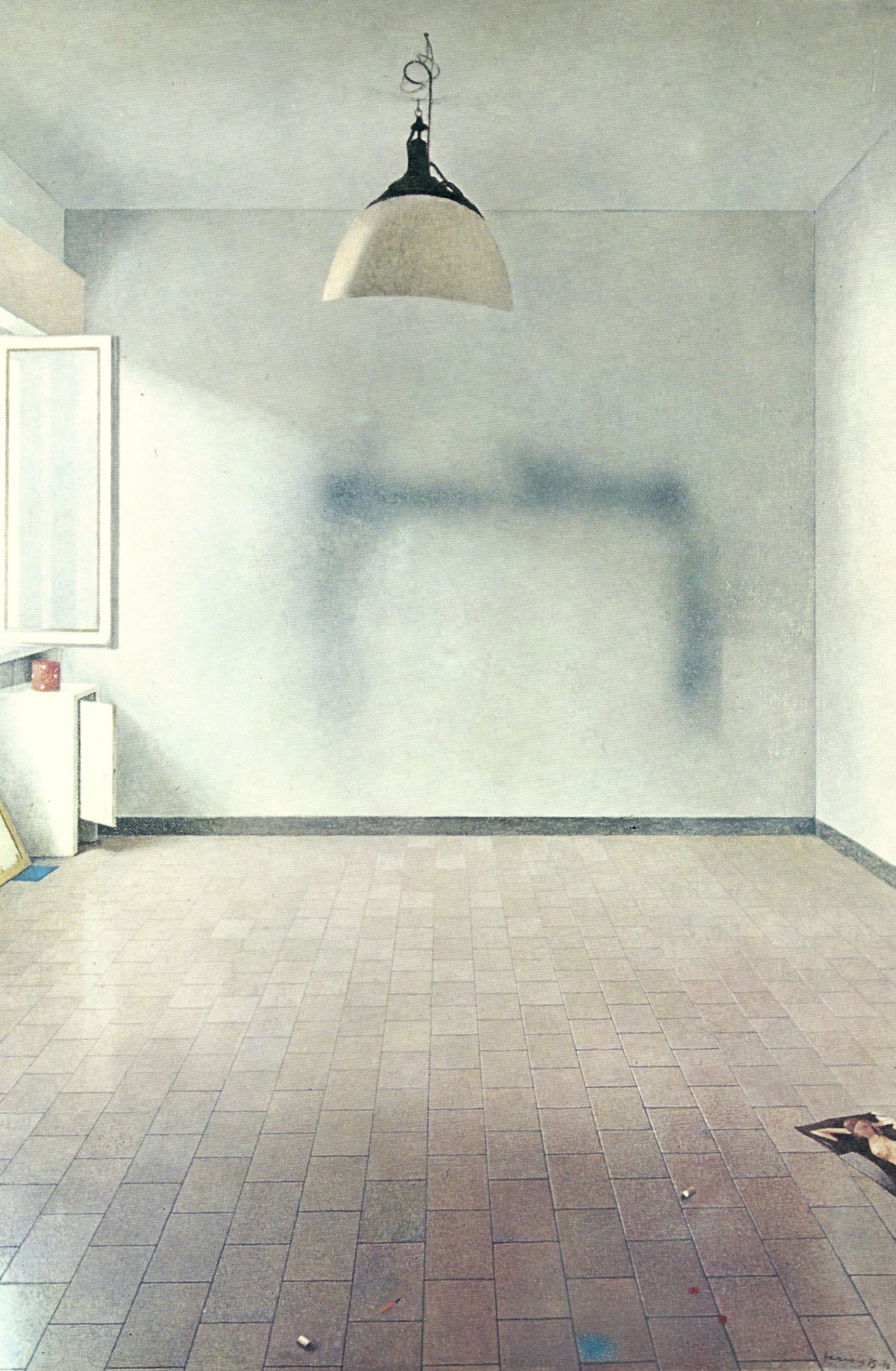 Dal testo di Chiara Gatti «Accadde in questo momento preciso che Ferroni, reggendo la sua linea come una stecca da biliardo, la sollevò verso l'alto, mentre lui si inginocchiava per impaginare la scena a livello del suolo, della polvere, dei brandelli di carta. Trascinato giù per terra, strisciando fra le fughe, inquadrando gocce di vernice e cavi elettrici strappati dalla presa, l'osservatore percepisce ora la prospettiva del pavimento inerpicarsi come un tramezzo fra sé e la scena schiacciata all'apice. Succede che la sedia del pittore, a volte, esca addirittura fuori dell'immagine, alludendo a uno spazio ulteriore, a una dimensione che prosegue. E succede anche che la parte superiore sparisca del tutto, concedendo a uno spigolo, a uno zoccolo di legno, al battente di una porta, di diventare protagonisti, come nella Analisi di un pavimento del 1979. Le mele di Cézanne non erano semplici frutti, così le ciotole di Morandi non erano solo scodelle. Anche i detriti familiari di Ferroni sono punti esatti che segnano ritmi e armonie sul diagramma cartesiano dell'esistenza, dove l'asse delle ascisse individua il limite di rottura fra la contingenza e l'assoluto».