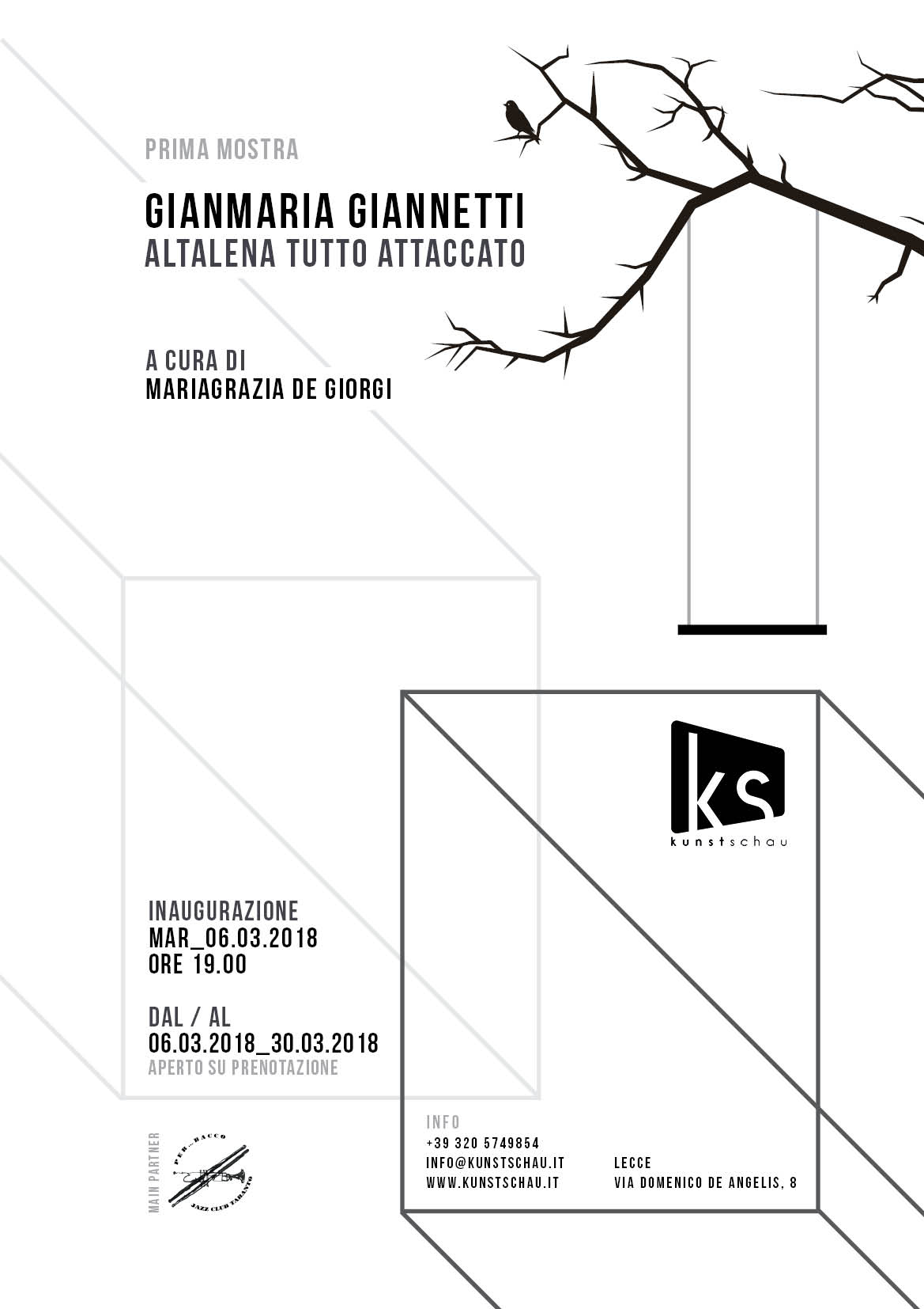 Martedì 6 marzo 2018 alle ore 19.00, Kunstschau_Contemporary Place a Lecce inaugura la mostra personale di Gianmaria Giannetti, (nato a Milano nel 1974, laureato in Filosofia Estetica all'Università degli Studi di Milano, vive e lavora tra Bari e Finale Ligure), dal titolo Altalena tutto attaccato, a cura di Mariagrazia De Giorgi.