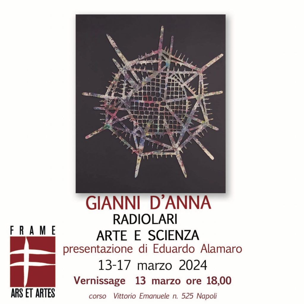 “Radiolari Arte e Scienza” mostra di Gianni D’Anna, a cura di Domenico Natale. Vernissage mercoledì 13 marzo ore 18:00, alla Frame Ars Artes di Napoli, in Corso V.Emanuele 525. Fino al 17 marzo. Info: framearsartes@libero.it, 329.7005119, 328.5823951.