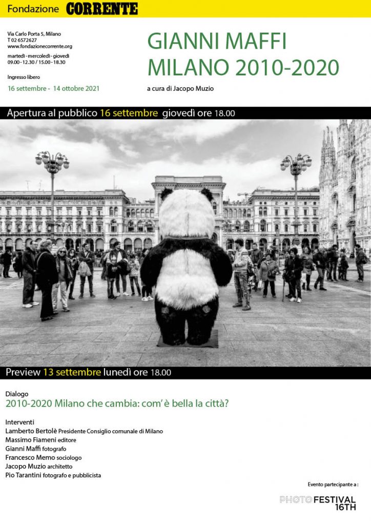 Come è cambiata la città? In mostra alla Fondazione Corrente, in occasione di Milano Photo Festival 2021, dieci anni di fotografia d’autore a Milano attraverso lo sguardo acuto e ironico di Gianni Maffi, che ha sezionato la città per temi e luoghi elevando la fotografia alla dimensione di documento storico: un ampio affresco che testimonia l’intima necessità di una riflessione sulle trasformazioni spaziali e sociali che hanno investito Milano nell’arco di dieci anni, un periodo di cambiamenti epocali accelerati da inattese dinamiche economiche e crescita di numero abitanti, la cui battuta di arresto temporanea è stata la pandemia. Quale città si è prodotta, quali abitanti, quali usi dei luoghi e identità si sono formati? Per un milanese cresciuto a Porta Romana lo straniamento è spesso presente in fermo immagine tesi e de saturati, dove la vita sembra aver perso colore e contrasto di fronte alla limitatezza del dibattito pubblico e civile, alla mancanza di proposte culturali diffuse sul territorio, all’invasione di un consumismo degli spazi pubblici che vede nella vetrina il principale “black mirror” della decaduta coscienza civile degli abitanti.