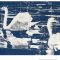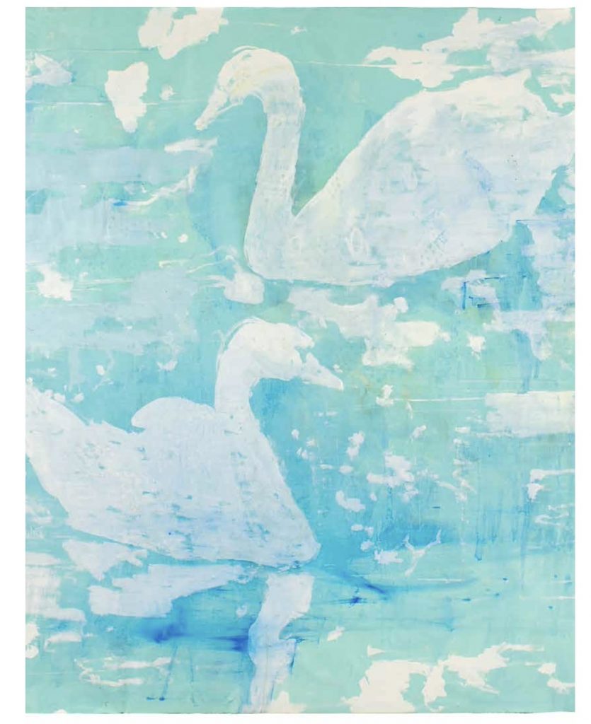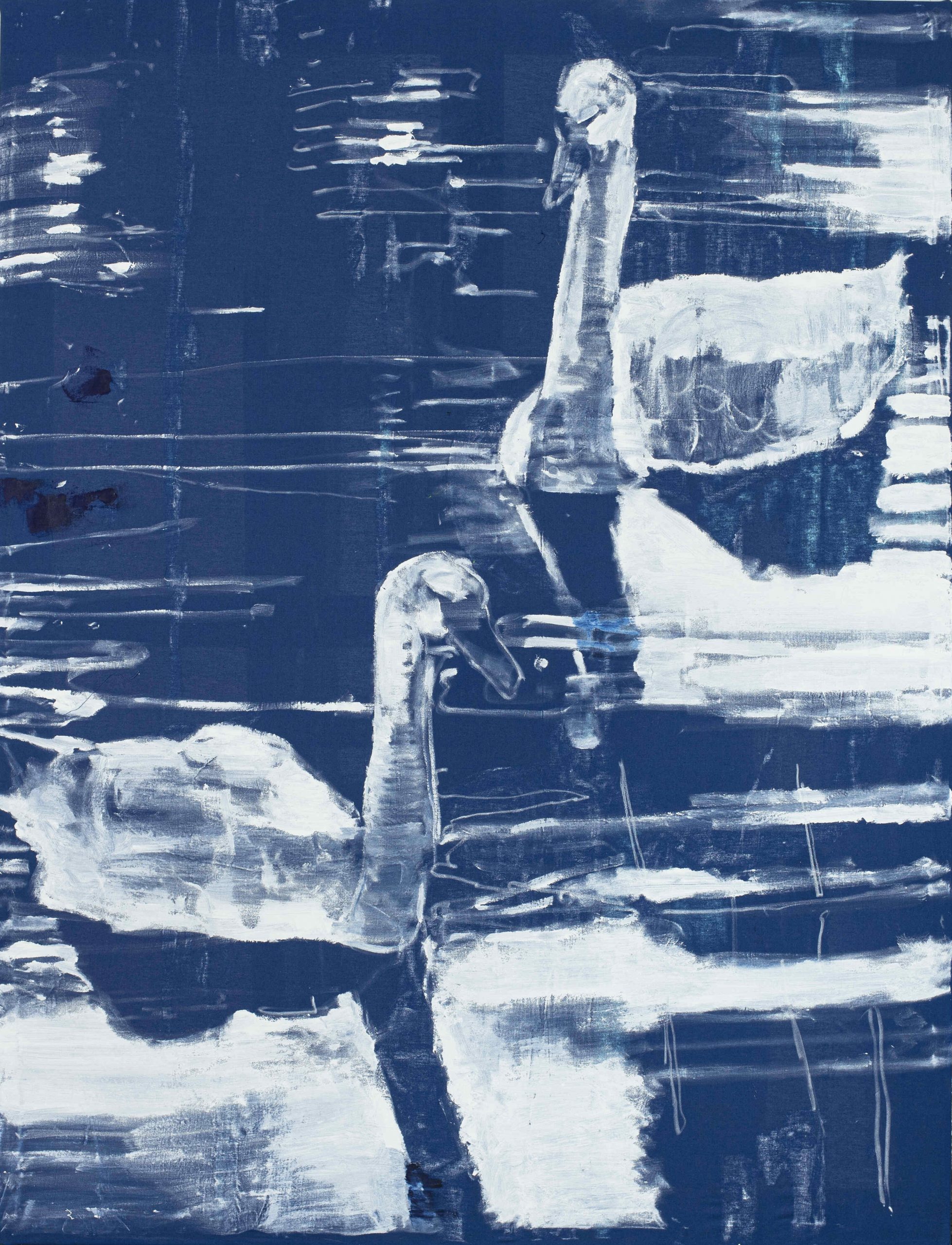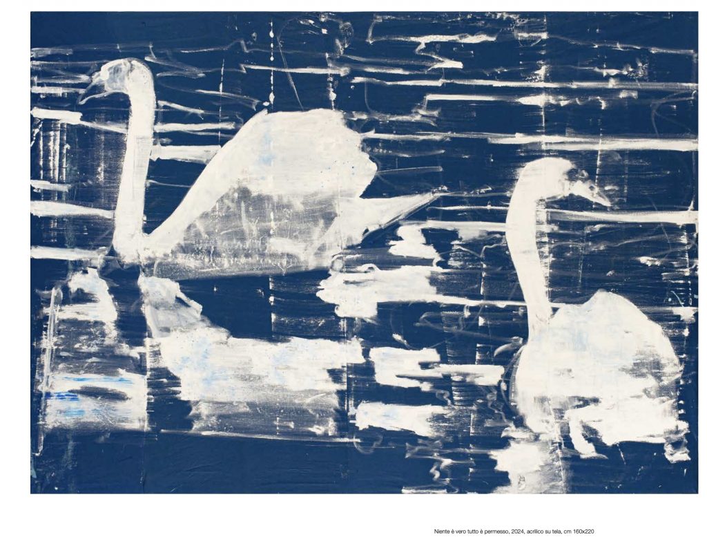 Sulle tele di tessuto dal colore blu profondo sfilano, come in una sequenza filmica, i cigni dal piumaggio bianco candido, richiamandosi l’un l’altro per poi disegnare insieme una storia dalle variabili infinite.Catturare il senso del movimento attraverso la pittura può aprire a molteplici visioni ed è proprio in questa direzione che Frangi ha lavorato alla mostra con un occhio agli studi sul movimento del noto fotografo Eadweard Muybridge.