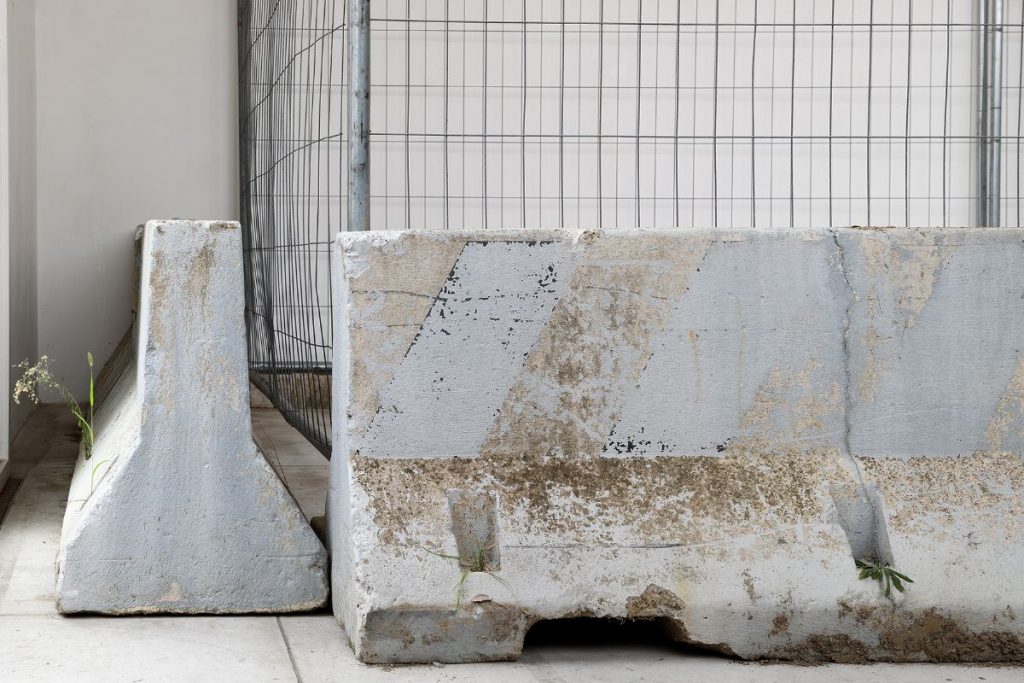 Dopo la personale nelle sale di Palazzo Fabroni del 2021, Giovanni Termini torna a Pistoia per presentare la sua recentissima produzione e a stravolgere, come suo consueto, lo spazio, accogliendo/respingendo lo spettatore con l’installazione “La misura di un intervallo” (2022), che divide realmente in due parti la galleria, creando una grande gabbia di reti metalliche fermate da barriere Jersey in cemento.