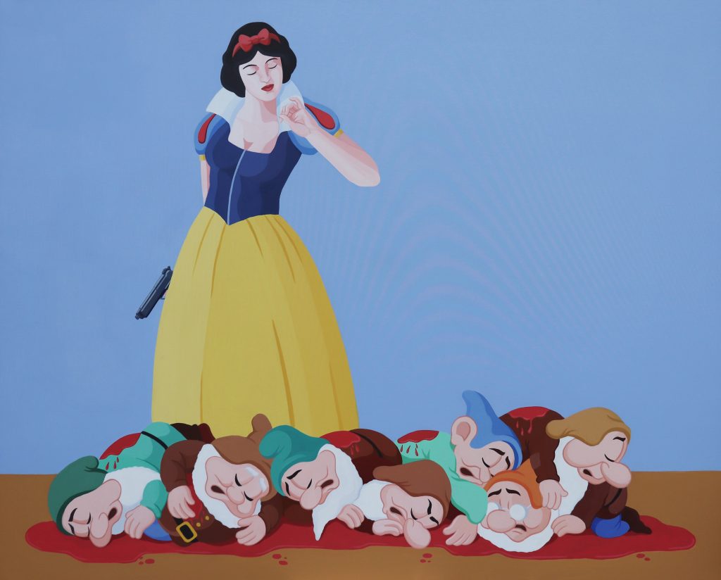 Fumetti e cartoon rappresentano il mondo in cui l’artista è immerso e l’atmosfera in cui la mostra condurrà i visitatori. Le debolezze e i falsi miti sono messi a nudo con un approccio ironico e provocatorio che da sempre contraddistingue il lavoro di Veneziano.
