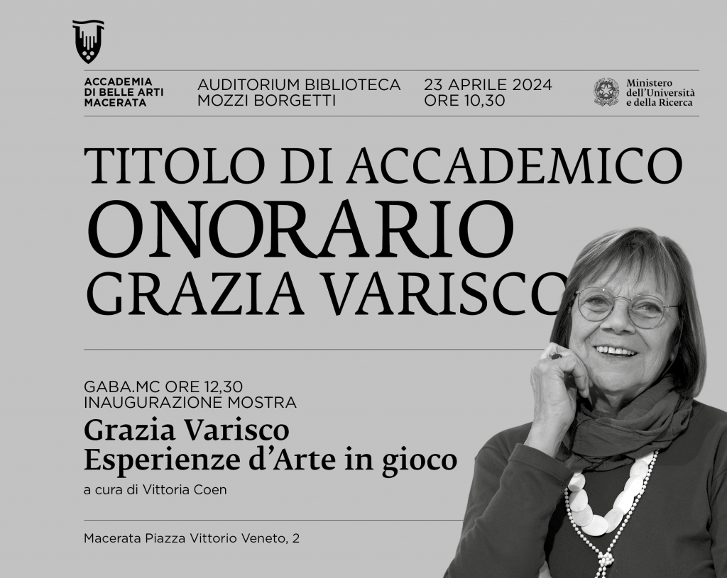 Grazia Varisco è l'Accademico Onorario 2024 dell'Accademia di Belle Arti di Macerata. La cerimonia cum Laudatio si svolgerà il 23 aprile alle ore 10.30. Segue l'apertura della mostra a cura di Vittoria Coen.