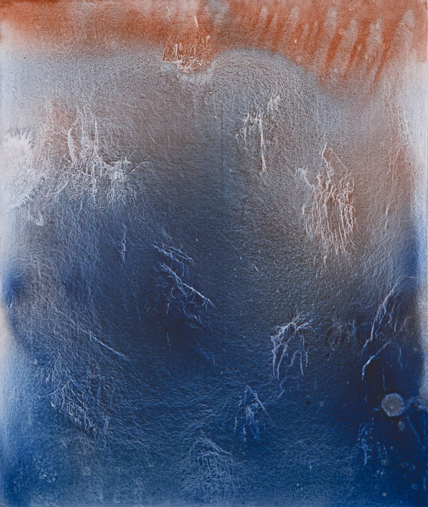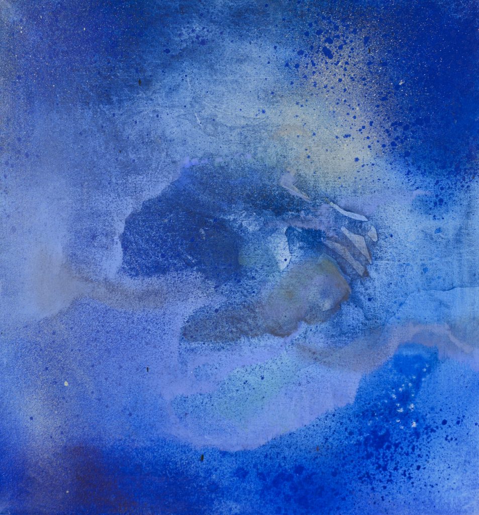 Dopo l’interessante esperienza di workshop al Padiglione Antares del Vega di Marghera nell’estate 2022, Guenda Nocentini sente di aver fatto un grosso salto qualitativo e di aver prodotto lavori importanti, tra i quali troviamo in mostra una piccola tela intitolata “Blu sincero”, tratta dalla tavolozza di colori di un’opera precedentemente realizzata.