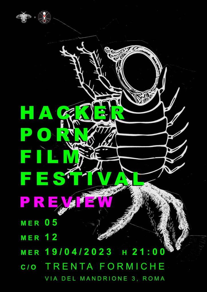 Hacker Porn porta a Roma il meglio del cinema kinky, weird, post porno e queer. Hackeriamo e destabilizziamo le aspettative su ciò che si considera eccitante, osceno, sconveniente, segreto. HPFF23 torna dal 26 al 30 aprile 2023 con la sua settima edizione, ospitata sempre nel bunker del Trenta Formiche. L’evento principale sarà preceduto da tre mercoledì (5, 12, 19 aprile) in cui presenteremo alcuni lavori della nuova edizione del festival.