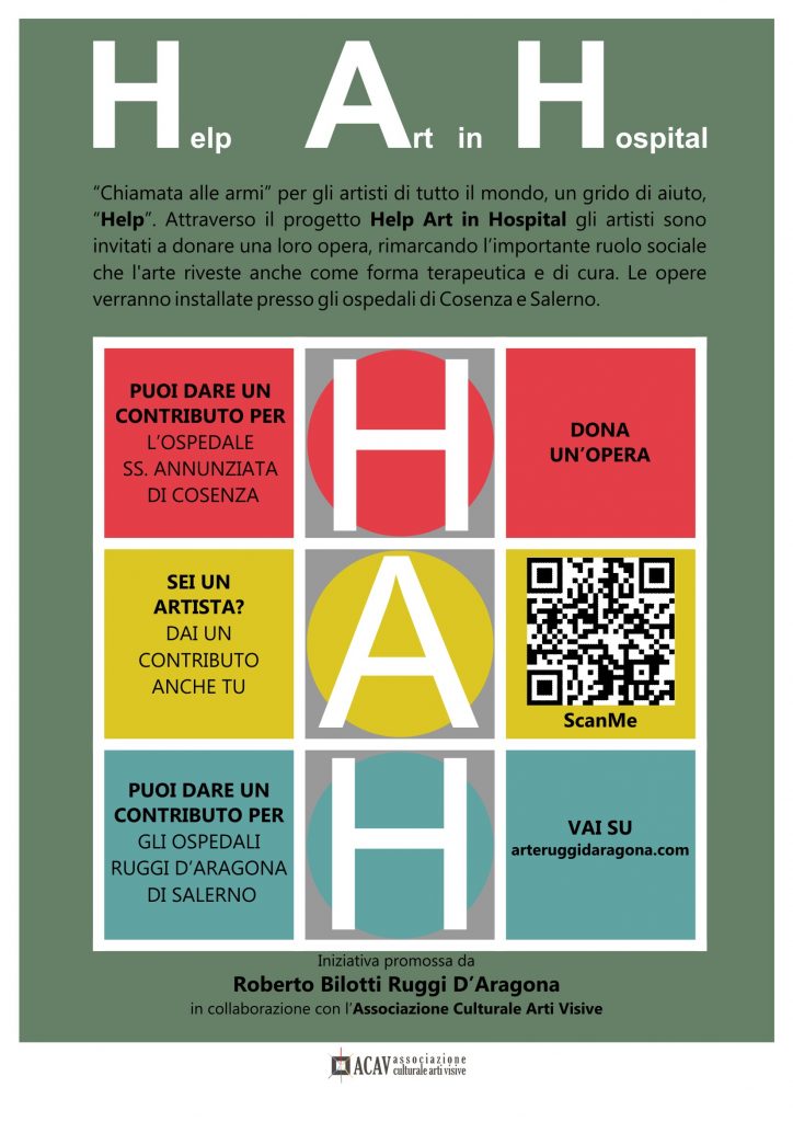 Parte una chiamata alle armi per gli artisti di tutto il mondo, un grido di aiuto in questo periodo di Pandemia causata dal covid19. La ripartenza dall’anno zero deve essere sotto il segno dell’arte partendo proprio da quei luoghi deputati a “fronte di guerra” come gli ospedali. Da qui nasce l’idea di una chiamata per gli artisti al fine di inondare di arte contemporanea gli Ospedali di Salerno e di Cosenza.