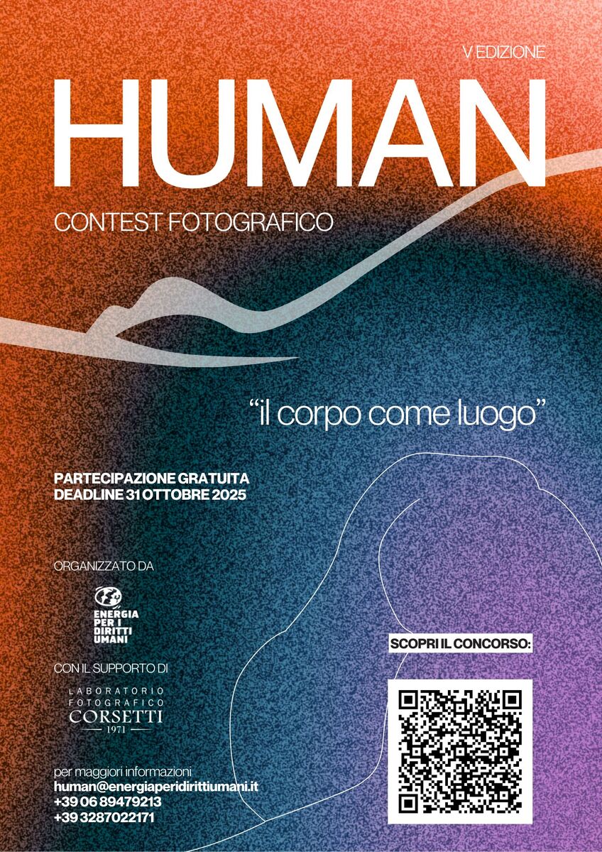 Sarà inaugurata a Roma, presso la Galleria delle Arti, sabato 29 novembre 2025, la mostra fotografica “HUMAN – Il corpo come luogo”, nella quale saranno esposte le 10 opere finaliste. Tramite la votazione del pubblico sul sito si può accedere a uno dei 10 posti finalisti, mentre i restanti 9 lavori verranno selezionati da una giuria di figure professioniste nel mondo della fotografia e dell’arte. Il termine per partecipare è il 31 ottobre 2025. Il bando completo di Human 2025 è disponibile qui: https://energiaperidirittiumani.it/human-il-corpo-come-luogo/.
