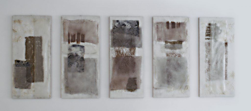 La serie TRAME, ha come focus la tessitura del metallo. La filosofia della croce, considerata nella sua eccezione di simbolo ancestrale, si esprime anche nella manifestazione di trama e ordito, questo intreccio, rappresentativo del legame tra l’umano e lo spirituale, è espresso nel gesto antico e sapiente del tessere, creando una texture primitiva. Gli oggetti metallici di colore giallo oro, vogliono rappresentare il sacro nel profano.