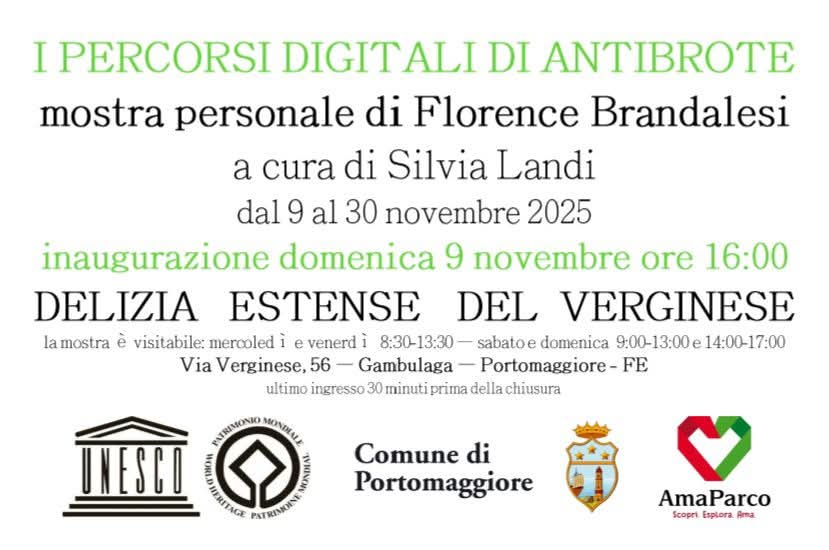 Domenica 9 novembre 2025 alle ore 16:00 sarà inaugurata la mostra personale “I percorsi digitali di Antibrote” dell’artista ferrarese Florence Brandalesi e contestualmente presentato il libro “I percorsi digitali di Antibrote” a cura di Silvia Landi, con interventi, oltre ai rappresentanti istituzionali, di Elena Grinetti e Fabio Messina rispettivamente responsabile delizia Estense del Verginese e genealogista, scrittore e marito dell’artista. L’evento vanta i patrocini dell’UNESCO (Organizzazione delle Nazioni Unite per l’Educazione, la Scienza e la Cultura), del Comune di Portomaggiore e di Ama Parco. La mostra rimarrà visitabile fino al 30 novembre 2025.