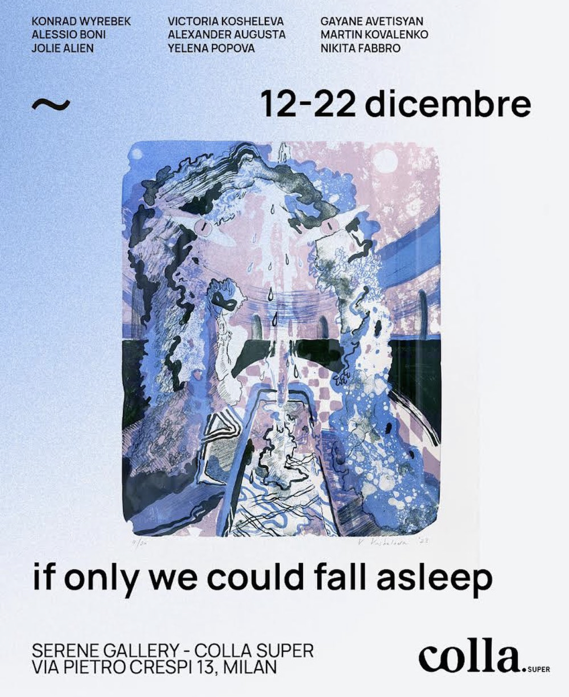 Serene Gallery è lieta di annunciare la mostra pop-up a Milano "If only we could fall asleep" (Se solo potessimo addormentarci) presso lo spazio Colla.Super in Via Pietro Crespi, 13. La mostra si svolgerà dal 12 al 22 dicembre. L'inaugurazione della mostra si svolgerà il 12 dicembre dalle 18 alle 20.