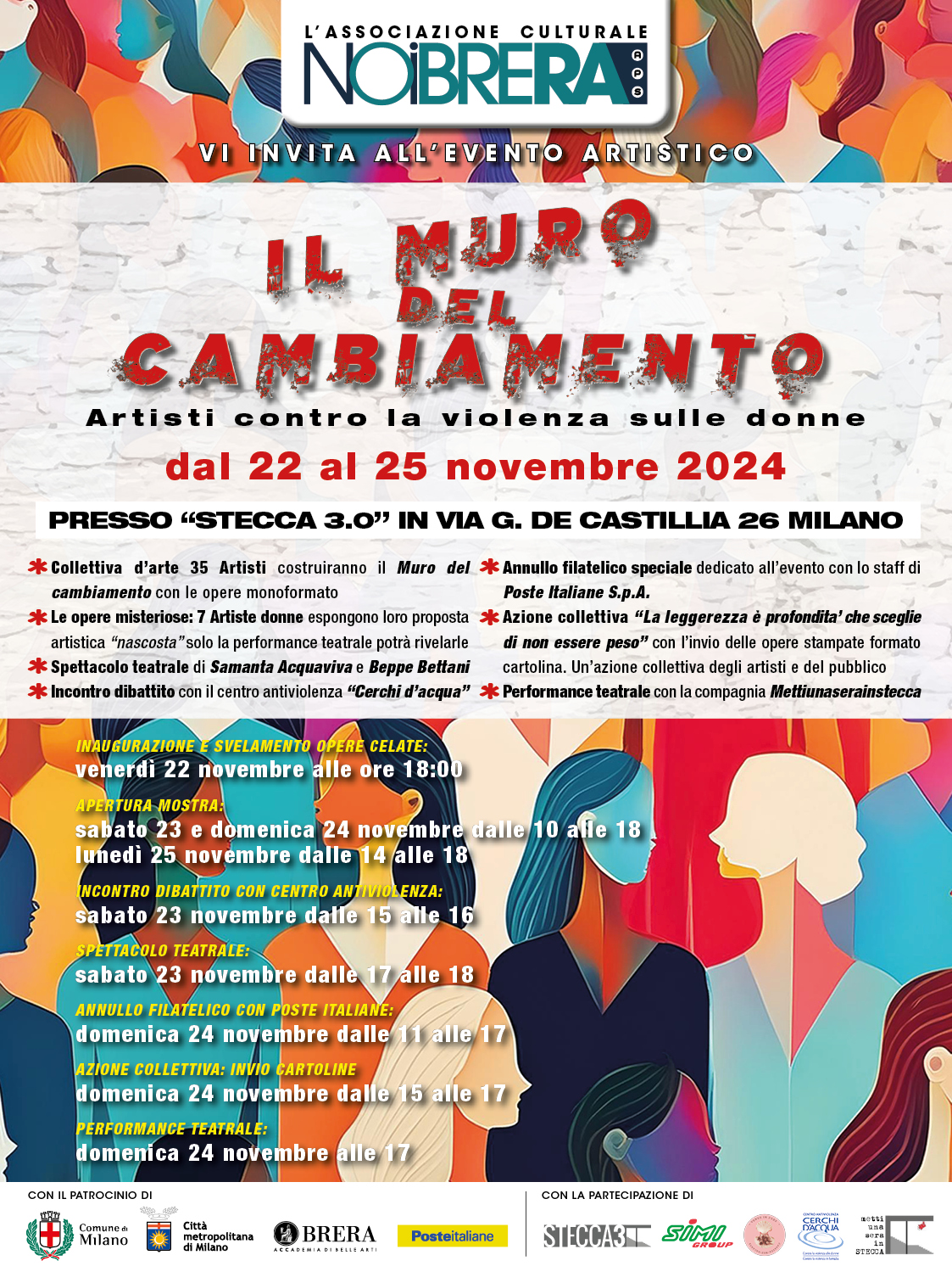La collettiva d’arte ospitata nel salone superiore di Stecca3 dal 22 al 25 novembre 2024, ha voluto celebrare la Giornata internazionale per l’eliminazione della violenza contro le donne ufficializzata dalle Nazioni Unite nel 1999. Sono stati coinvolti 42 artisti, italiani ed internazionali, che con le loro opere hanno esplorato questo tema, soffermandosi su concetti quali il rispetto, la dignità e l’uguaglianza ma anche il contrasto a qualsiasi forma di violenza di genere come quella domestica o lo stalking, solo per citarne alcuni. Ogni partecipante ha trasferito le sue riflessioni, ciascuno secondo la propria arte e la propria sensibilità, su di un supporto dalle dimensioni ben precise provando a far luce su quei fattori socio-culturali come il patriarcato, il gender gap o l’impunità dell’esecutore, che ancora oggi contribuiscono al perdurare di questo tipo di comportamenti. L’iniziativa è nata da un’idea dell’Assemblea dell’Associazione culturale NOIBRERA APS che, sin dalla sua formazione, utilizza l’arte come mezzo per promuovere la consapevolezza tra gli uomini e le donne del nostro tempo, stimolando la riflessione sulle tematiche del nostro presente. Le opere saranno presentate al pubblico, su di un’installazione a rappresentazione di un Muro. Dunque, gli artisti con il loro agire hanno costruito: