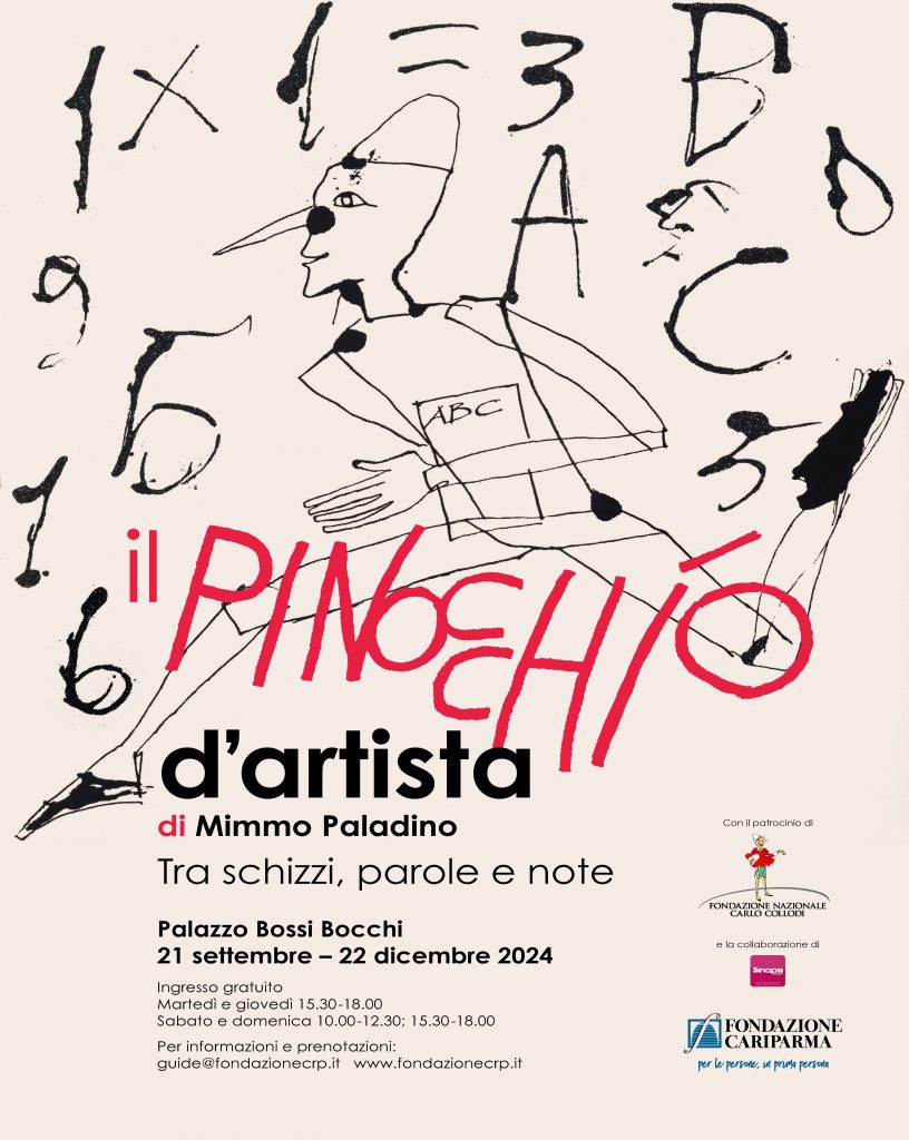 In esposizione a Palazzo Bossi Bocchi, sede di Fondazione Cariparma, 26 tavole grafiche del libro d’artista di Mimmo Paladino della Collezione Mingardi, 30 edizioni italiane del libro di Carlo Lorenzini in arte Collodi e 70 sculture in legno del progetto “Pinocchio all’Opera” di Fondazione Nazionale Carlo Collodi in collaborazione con Sinapsi Group