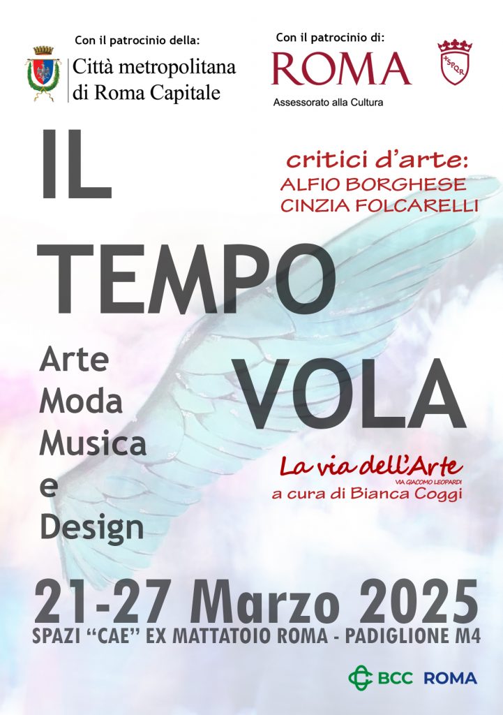Dal 21 al 27 marzo 2025, il Padiglione M4 - Spazi CAE ex Mattatoio di Roma ospiterà la mostra d’arte "IL TEMPO VOLA". Curata da Bianca Coggi e dall’Associazione La Via dell’Arte di Colleferro, l’esposizione verrà presentata dai critici d’Arte Alfio Borghese e Cinzia Folcarelli.