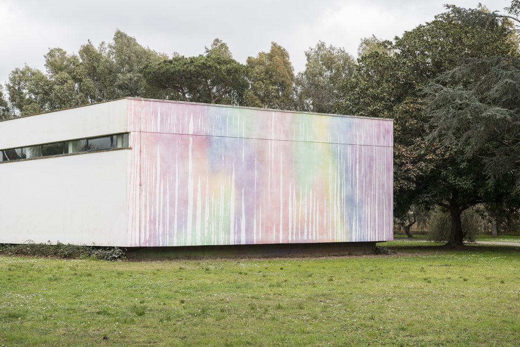 Nei colori del giorno, dove i rapporti tra i colori primari e secondari si intersecano in una fantasmagoria cromatica, normalmente è invisibile, ma, come un arcobaleno, si attiva con la pioggia. Quando l’opera si bagna la superficie lascia infatti trasparire i colori, mentre, quando la patina superficiale si asciuga, il colore gradualmente scompare e il muro torna bianco. Un impianto idraulico, inoltre, permette di bagnare la parete a cascata volontariamente, generando una serie di segni diversi caratterizzati da un dripping verticale. L’opera rimanda alla meraviglia della visione, al rapporto tra arte e natura, tra tecnica e miracolo. È anche un monito di speranza che si rinnova: un patto tra cielo e terra celebrato nella «casa» di un grande artista.