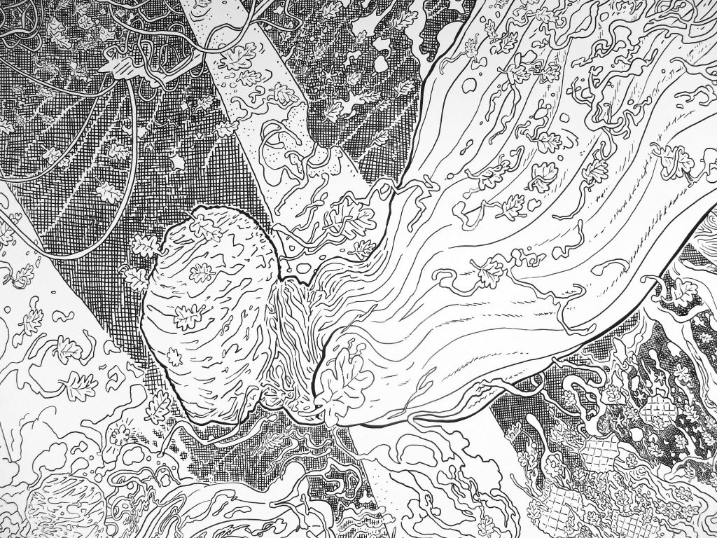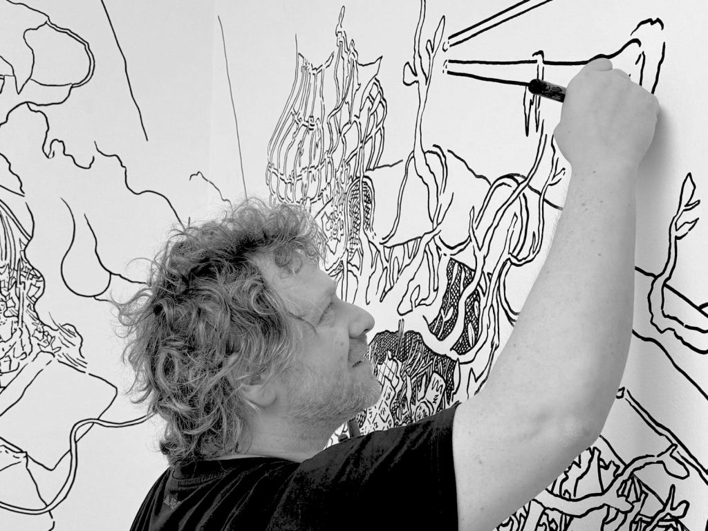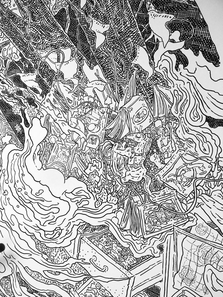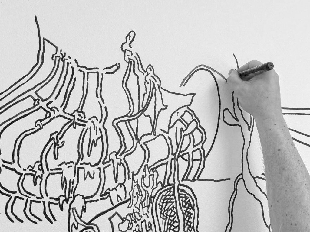 Il lavoro di Hu-Be sviluppa lungo le pareti tre tempi di un’esplosione, compressi e sovrapposti. Si tratta del “durante”, del “dopo” e di un tempo che non ci appartiene. Definiscono i primi due tempi la presenza degli oggetti quotidiani e i resti dei detriti di uno spazio abitato. Nella dimensione temporale che non possiamo comprendere si muovono le figure: sono come lenzuoli che avvolgono essenze immateriali, che a tratti si definiscono, si trasformano continuamente per loro stessa sostanza, modellati da torsioni, accelerazioni e vortici d’aria. Superando la loro consistenza leggera, trovano la forza di muoversi in esplorazione lungo traiettorie non tracciate e fluttuando si avvicinano, liberi di incontrarsi o di respingersi.