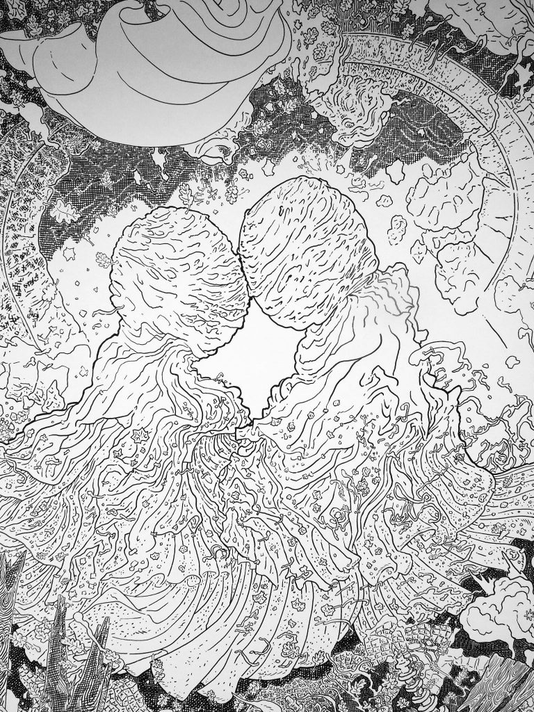 Due figure al centro della parete principale si cercano, si sfiorano. Sembra essere questo un punto di maggiore concentrazione dell’energia che governa l’intera composizione. Sembra nascere da qui un ulteriore vortice vertiginoso, nuove correnti, un boato che apre ad un’ulteriore profondità spaziale. Il contatto tra le due figure è generatore di nuova energia dirompente, capace di spostare materia. Se non possiamo cambiare gli eventi, possiamo generare energia. Alla distruzione può seguire la ricostruzione, risultato dello spostamento di sostanze leggere o pesanti, rispetto alle quali serve la stessa attenzione, lo stesso impegno.