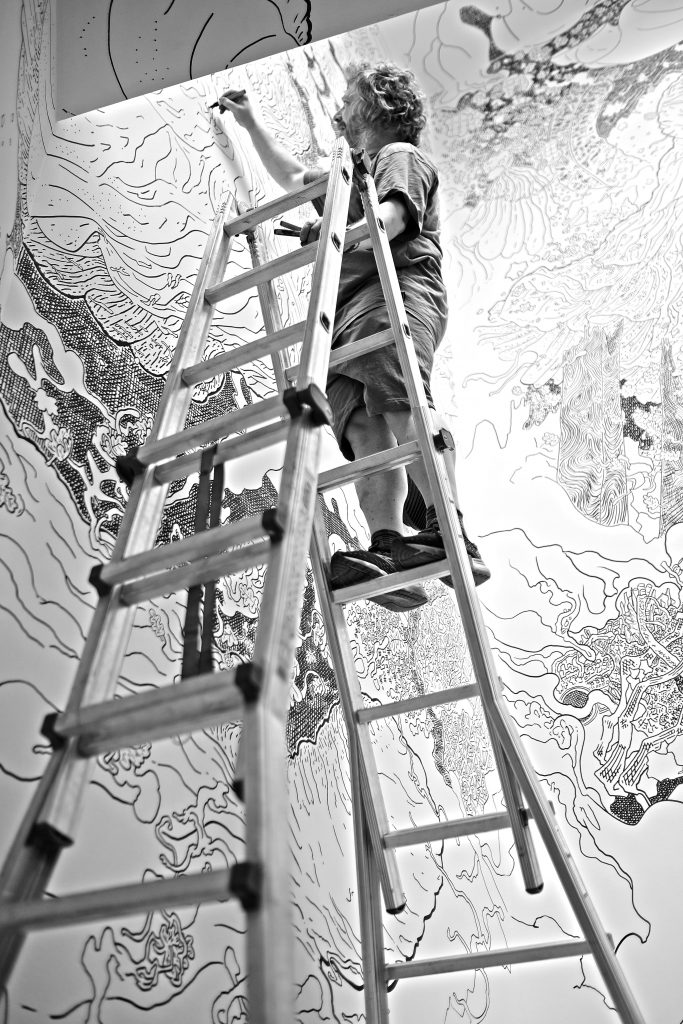 Come osservatori, varcata la soglia, attraversiamo lo spazio in ascensione, salendo le scale: ognuno con il proprio corpo, le proprie storie, le proprie idee. Ciò che ci circonda è un’esplosione dello spazio, la distruzione dei muri che lo racchiudono. Le pareti e il soffitto si spalancano con il disegno ad una profondità spazio-temporale infinita. Assistiamo ad uno spettacolo di rovine e sfacelo che dilata lo spazio fisico che ci circonda.