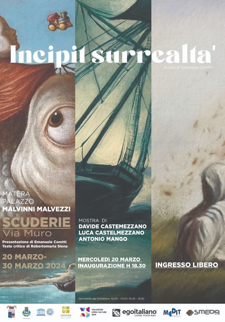 Incipit surrealtà è una mostra collettiva di pittura. Tre giovani artisti lucani esporranno 15 opere olio su tela. Gli artisti proporranno immagini di carattere neo-surrealista edificate su una salda prassi pittorica tradizionale.