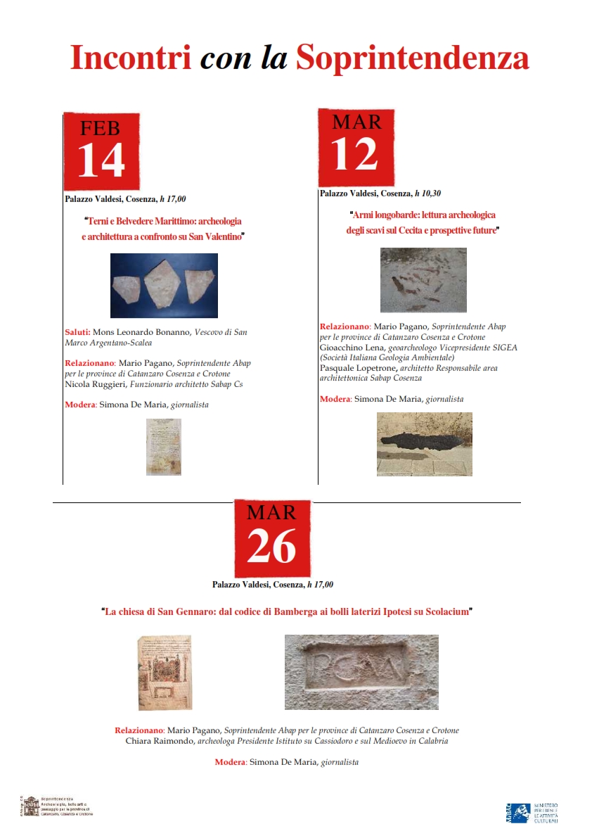 “Incontri con la Soprintendenza” è un ciclo di conversazioni su archeologia e architettura che l’ente preposto alla tutela e alla conservazione del patrimonio culturale promuoverà tra febbraio e marzo nell’ufficio centrale di Cosenza.