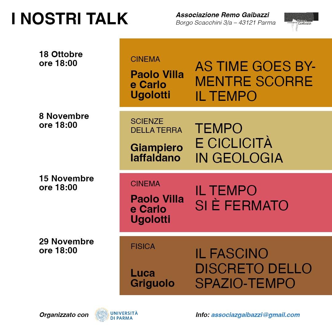 L’Associazione Remo Gaibazzi organizza una serie di conferenze dedicate al tema della “forma del Tempo”, argomento affrontato anche nella mostra, patrocinata dal Comune di Parma, in corso presso la sede dell’Associazione.