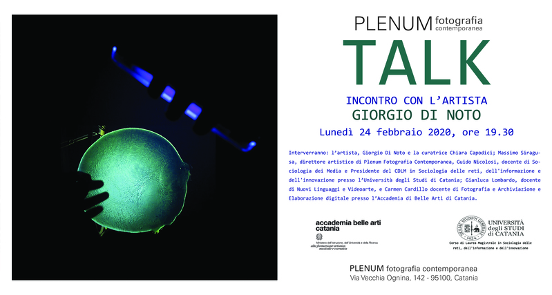 Lunedì 24 febbraio alle ore 18930 - il giorno successivo all’inaugurazione della sua personale, The Iceberg - si terrà, sempre presso lo spazio Plenum – Fotografia Contemporanea di Catania, un incontro con l’artista romano Giorgio Di Noto in cui saranno affrontate, con un taglio corale e trasversale, alcune tematiche presenti nella sua ricerca.