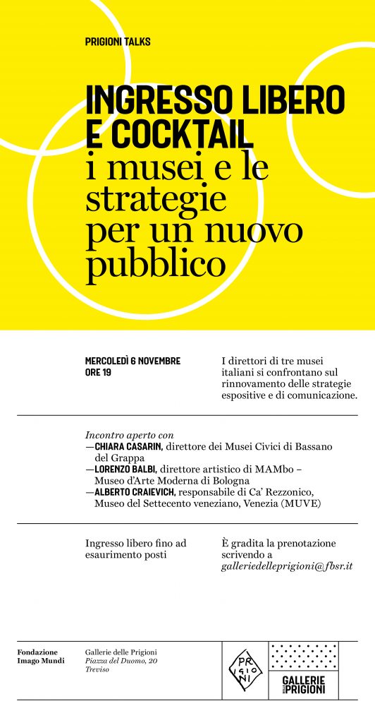 Tre direttori di altrettanti musei italiani (Chiara Casarin, Musei Civici di Bassano del Grappa; Lorenzo Balbi, MAMbo – Museo d’Arte Moderna di Bologna; Alberto Craievich, Ca’ Rezzonico, Venezia, Museo del Settecento veneziano) si confronteranno su nuovi orizzonti, obiettivi e sfide del XXI secolo per rinnovare e innovare la relazione tra i musei, luoghi depositari dell’impareggiabile patrimonio artistico del nostro paese, e i loro pubblici.